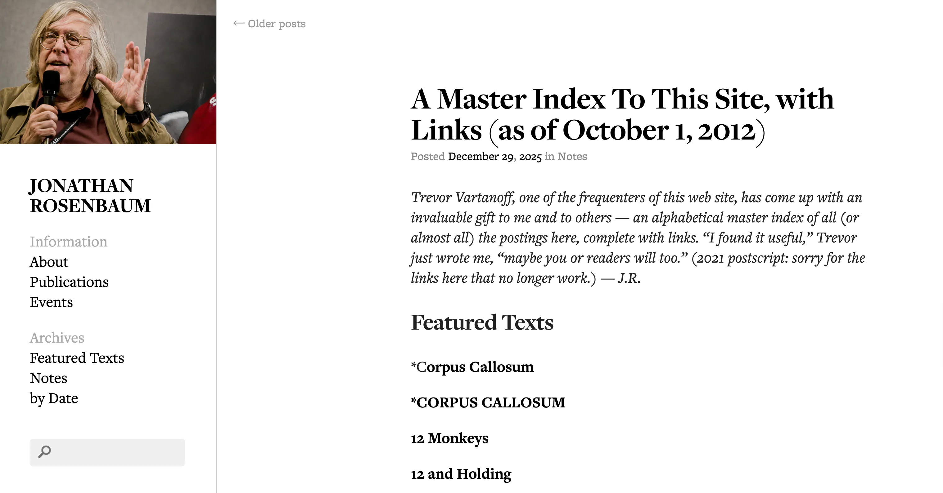 同样,年近八十的乔纳森·罗森鲍姆[Jonathan Rosenbaum]至今仍在将他半个世纪来的大小写作,从大型专论到日报短评,上传至自己的个人博客https://jonathanrosenbaum.net中;而在美国影评人泰格·格拉格[Tag Gallagher]的个人博客https://tagmax.blogspot.com(需科学上网)上,除了他关于约翰·福特的著作外,影迷还能免费下载他几十年来为各种影碟厂商制作的上百种视频论文。