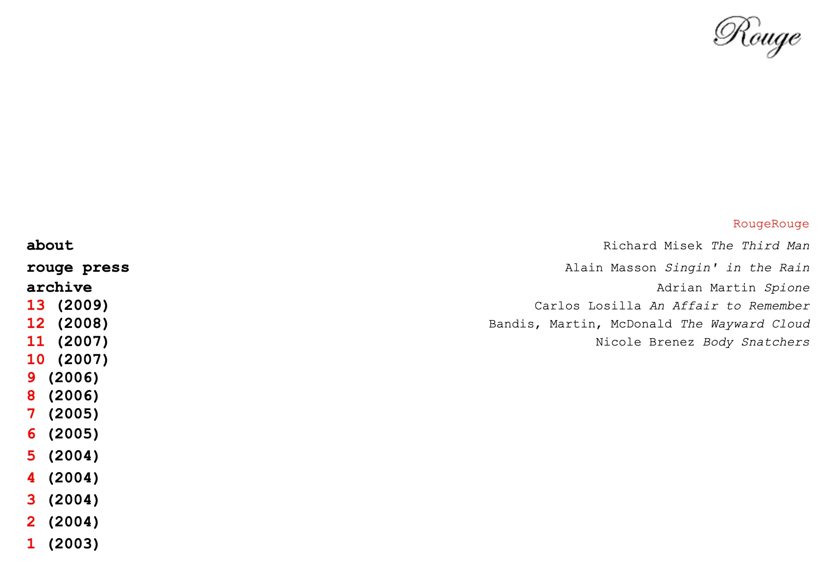这些小型网站的优势莫过于其独立性,哪怕在站点本身不再运营后,仍然像一本书一样可以被返回和翻阅。例如,影评人亚德里安·马丁[Adrian Martin,个人网站:https://adrianmartinfilmcritic.com]、海伦·班迪斯[Helen Bandis]和格兰特·麦克唐纳[Grant McDonald]创立的电子杂志ROUGE [http://rouge.com.au],无疑是21世纪初期网络迷影的掌上明珠,尽管早在2009年便已停止更新,但网站本身依旧能被访问。ROUGE极度简洁的版面或许会让当代网络用户觉得惊讶,且并不采用日常更新的模式,而是以电子刊物的形式定期进行更新内容(从最初的季刊到后期的年刊),每一期的内容和主题均经过精心策划。为ROUGE写作的评论家群星聚集,包括了莲实重彦、妮可·贝内兹[Nicole Brenez]、米格尔·玛丽亚斯[Miguel Marías]等人文章的英译版本。在ROUGE停更后,马丁又在2011年创立了类似运营模式的LOLA Journal [https://lolajournal.com/],可惜如今已无法正常访问。