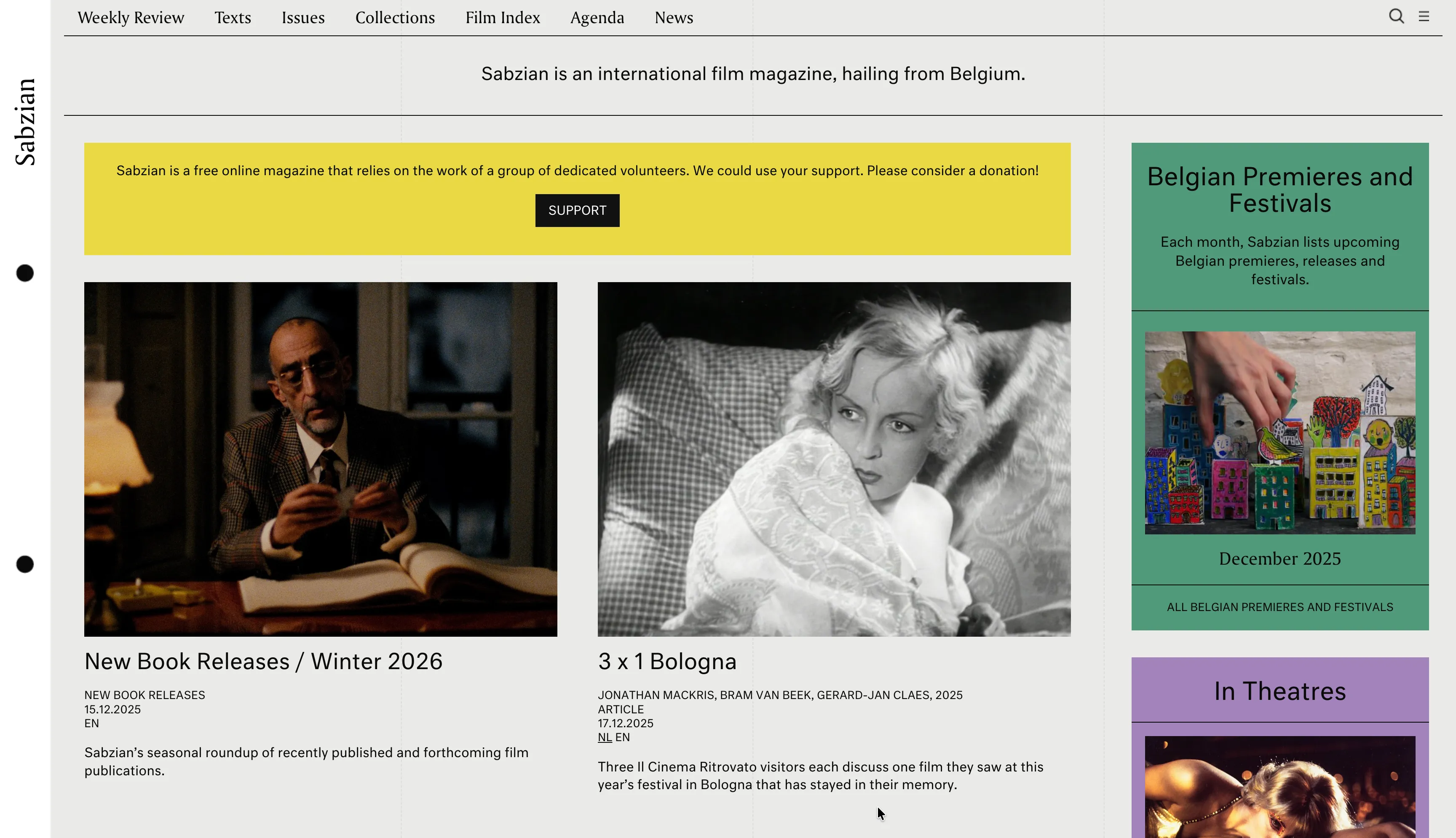 同样将写作、译介、档案整理和放映结合起来的还有来自荷兰的网站Sabzian [https://sabzian.be/,名字取自阿巴斯·基亚罗斯塔米的《特写》中的人物],或许也是本文要书写的规模最大,设计最为复杂的独立网站之一。Sabzian是少数用三种语言进行发表的网站,不少文字均有荷兰语/法文/英文三种语言可选,并且在每年年底邀请知名电影人参与其一年一度的“State of Cinema”系列文章的写作,对当下电影和图像生态进行不同角度的探讨(近几年受邀的包括伊莎贝拉·于佩尔、王兵、贝内兹、奥利维耶·阿萨亚斯等)。Sabzian的另一特色包括其条目数据库,也是本文所述站点中唯一为单个电影/影人建立条目页面的网站,而其建立条目的逻辑也并非单纯在页面之下整合网站内部的文章内容,更会在每一条目下精心挑选对作品/影人较为重要的文献节选,包括名言金句、评论以及采访选段等。此外,Sabzian也会每个季度发表一篇当季重要电影书籍的出版汇总,十分丰富。专题内容也自然不可或缺,同样和线下放映联动:在刚刚过去的十一月,网站发表了英文世界第一个关于安德烈·巴赞的电视批评的专题,而在九月,网站则为ICA的塞尔日·达内系列放映策划影片选择,并发表了文章和翻译专栏。