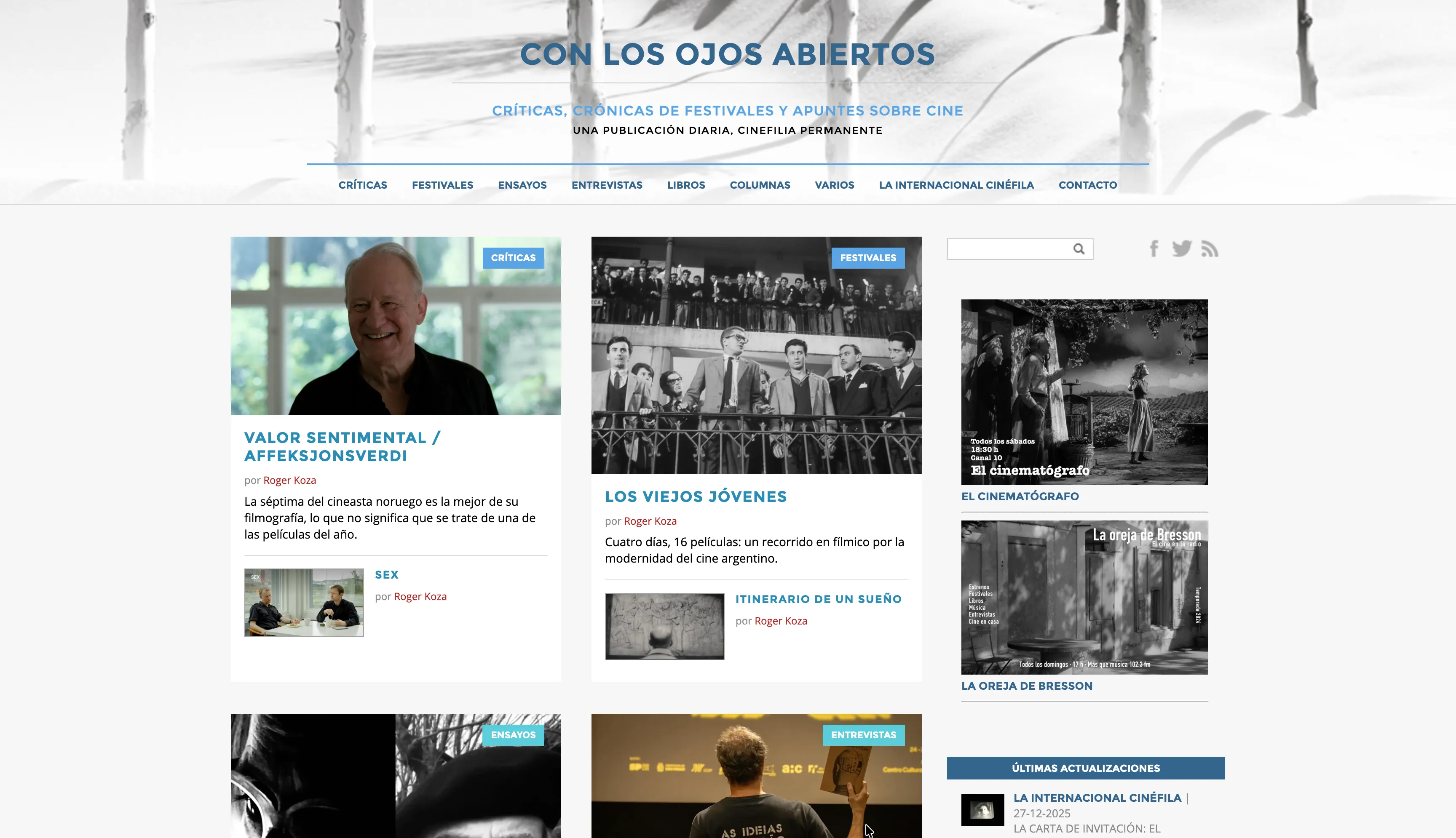 许多非欧美世界的电影写作因网络时代变得触手可及。阿根廷的影评人罗杰·科扎[Roger Koza]创立的网站Con los ojos abiertos [https://conlosojosabiertos.com]已经运营了几十载,是了解拉美电影世界的重要渠道,其招牌节目——一年一度的年度电影评选“La internacional cinéfila”,聚集了上百位世界各地的电影人的年度选择,以南美地区的评论家为主。值得一提的是,该网站的评论区中,甚至还能一览阿根廷当地的影评人、影迷与诸如马里亚诺·利纳斯这样的著名作者之间的激烈论战,而除了科扎本人的写作,Con los ojos abiertos也为众多其它影评人提供平台,甚至于一部电影经常不会只拥有单独的影评:例如利纳斯的《科西尼:故土乡音》和卢奎西亚·马特尔的《我们的土地》,都有来自多位评论家的不同视角和观点的写作。除了网站以外,科扎也拥有自己的视频播客和广播节目。