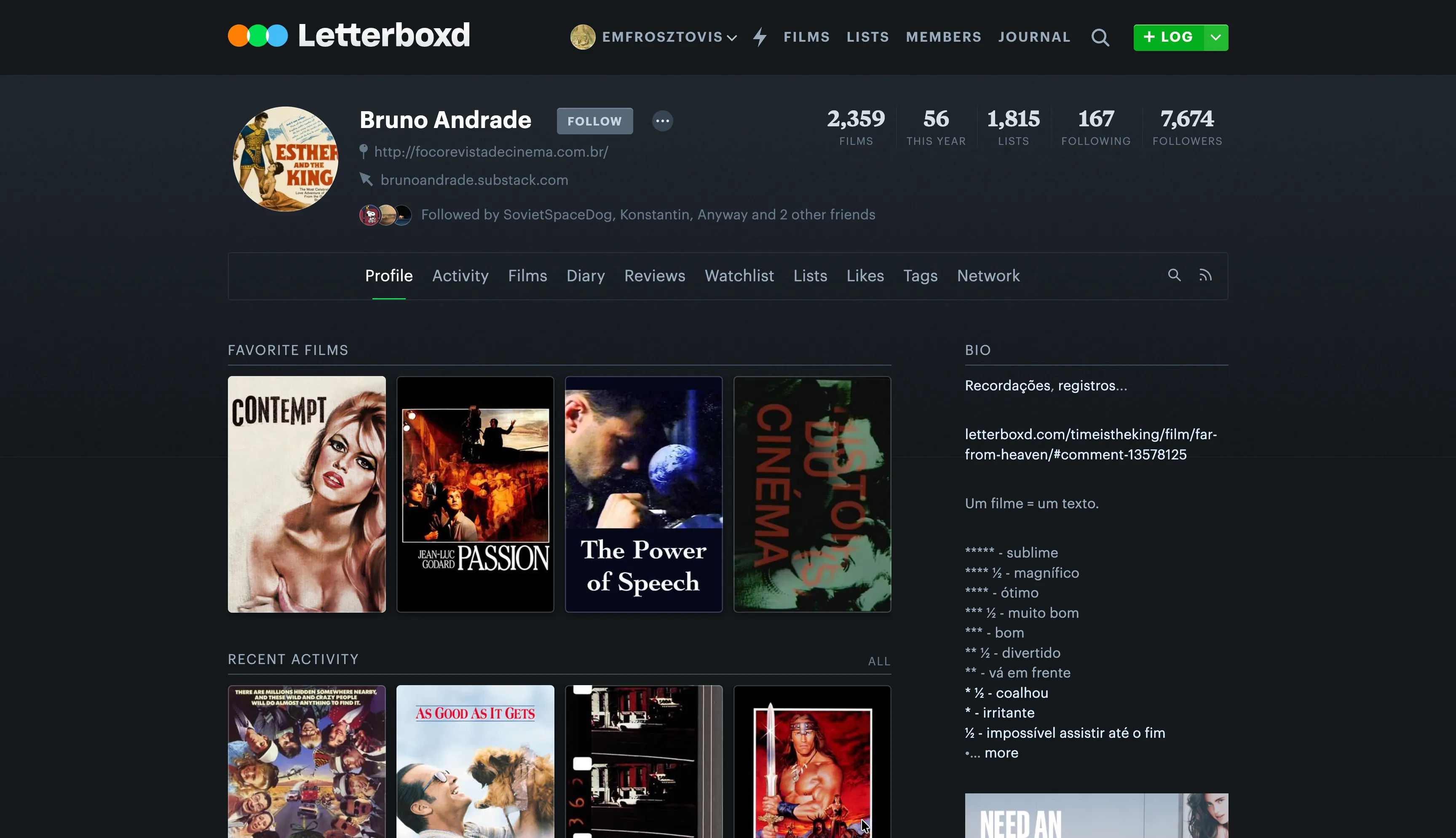 最后值得一说的,还有当下全世界“最大”的电影评论网站,Letterboxd。尽管它属于前文中所提到的“整合型网站”,且内容水准鱼龙混杂,但其中不乏全球各地评论家、深度影迷和媒体的身影,从《电影手册》主编到不知名的个人杂志,等等。更有趣的是,影迷们能在Letterboxd上找到为一些著名作者/杂志专门创建的非官方账号,以档案性质收集其写作内容(巴西影评人布鲁诺·安德拉德[https://letterboxd.com/timeistheking/]的评论中便大量援引了外部内容,堪称一个资料库),从《手册》的著名影评人(戈达尔、特吕弗、侯麦等等)到罗戈里奥·斯甘泽[Rogério Sganzerla,https://letterboxd.com/notsganzerla/]、米格尔·玛丽亚斯[Miguel Marías,https://letterboxd.com/marias_in_eng/]等拉美地区的作者(西葡语区用户在网站上的活跃度尤其喜人)。毫无疑问,Letterboxd的用户生命力、功能性、以及数据库的完备程度,都为这样的工作铺平了道路。