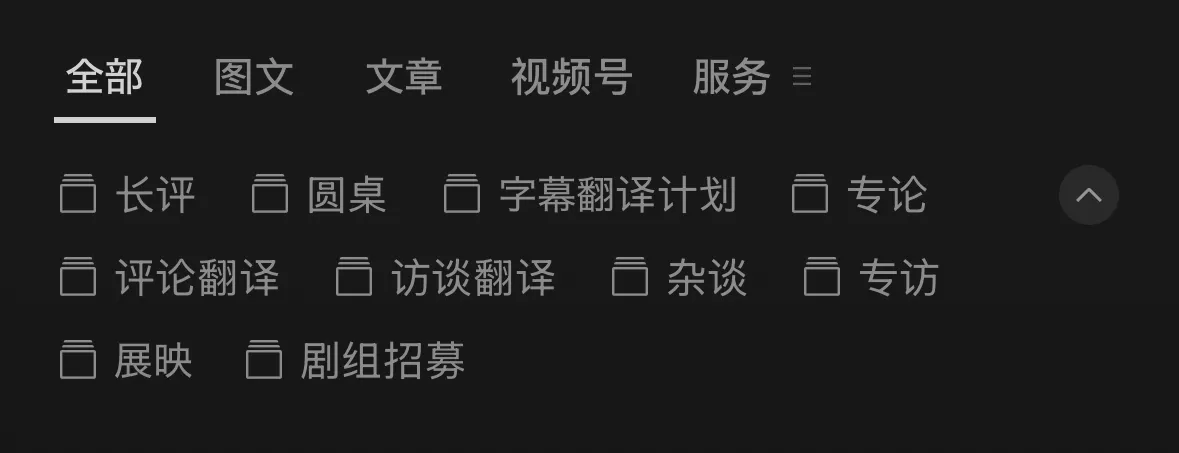 竖屏对于排版的限制自是不用说。竖屏推送、每天只能推送一次且以单篇为主——这种基于时间轴的线性信息流并不利于检索,也使得文章间的关系很难呈现为并列或非线性的。单篇推送内部是单一层级,多篇推送之间也没有好的标签分类机制。公众号主页的合集下拉菜单只能纵向地按照「评论」「翻译」「专访」等板块进行分类,但当我们想要在内容之间进行横向跳跃(如某个主题、某位导演或某期展映相关)就显得力有不逮。而豆瓣很晚才加入的Selects功能也难以进行复合逻辑的分类,并且因为显示范围有限,要放置多个分类也会导致页面缺乏条理,浏览起来不够清晰。诸如此类的特征(当然还有审查机制),使公众号和豆瓣都难以对内容进行更丰富的呈现和更细致的归档留存。