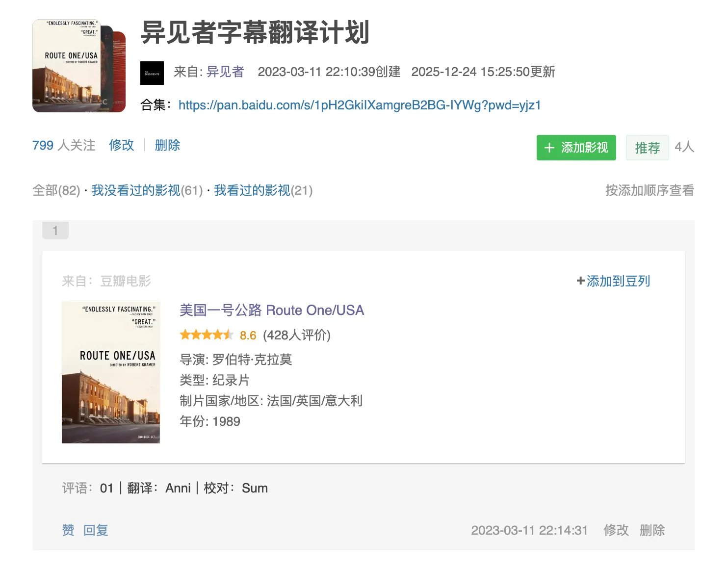 2023年1月16日,距离这篇总结发布刚好三年前,异见者发布了第一篇推文,也是“异见者字幕翻译计划”的第1期,一部对我们中的许多人来说十分重要的杰作,《美国一号公路》[Route One/USA, 1989]。截止到25年底,“异见者字幕翻译计划”已经进行到了73期,还有30部左右的影片正在翻译/校对的过程中,等待陆续的完成和发布。目前,异见者翻译部正在持续对外招募,已有包括英语、法语、日语、德语等语种在内的70多位译者。