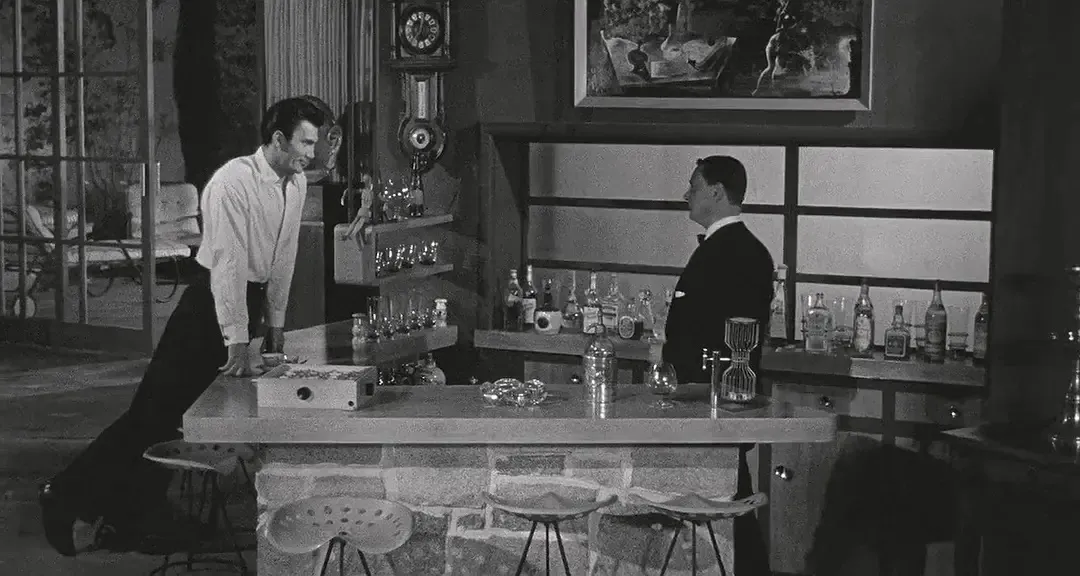 《桃色血案》[Anatomy of a Murder, 1959]。整部电影,先是通过其主题本身,继而是通过普雷明格的立场,建立在场面调度的双重运动之上:批评与质询,审判与对奥秘的承认;两种运动,彼此包含,彼此不断转化。