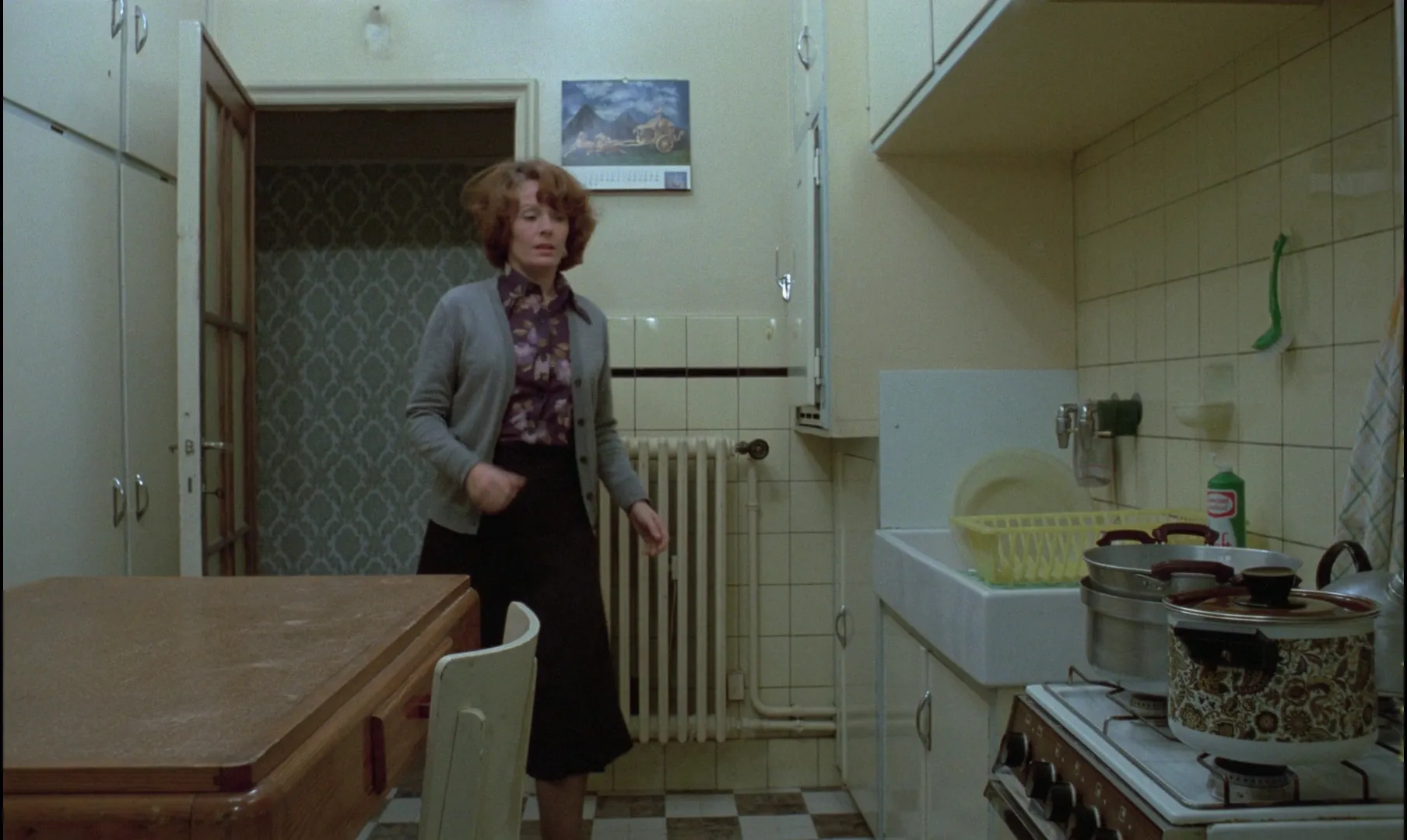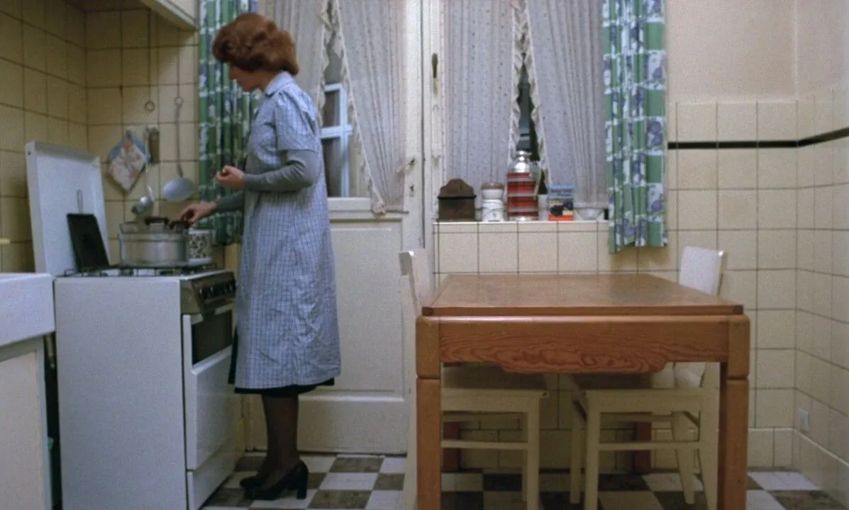 电影的第一个镜头,就是厨房里,让娜·迪尔曼在炖一锅土豆。刚给煤气灶点上火,门铃就响了一声。于是她脱下工作服,洗了手,用一块彩色格子擦手布擦干净,然后关掉灯,走了出去。当她和来客打招呼时,昏暗的厨房定格了。就在第二天,我们会意识到这是危险的,因为它打断了连续性。