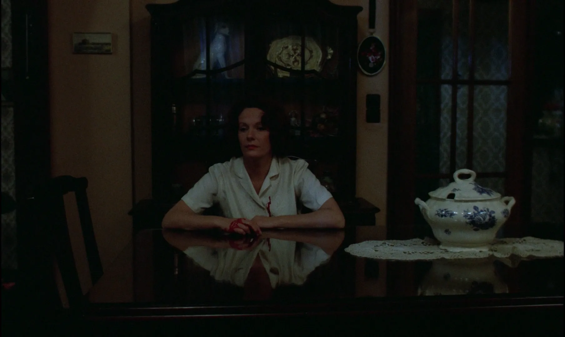 阿克曼曾经说到电影的最后一个镜头:“这不是让娜·迪尔曼的秘密,这是德菲因·塞里格的秘密。”那么我再引用友邻 Anni 的一句话:“我们之所以觉得有秘密,是因为有差异。”影片最后,这位女性坐在餐桌前,手上、衣服上都带着血。剧场般的蓝光在客厅里闪烁,我们还是和她隔着一张桌子,那上面印着她的倒影,也记录着她曾在这里做的事——把钱放进陶瓷罐里,铺桌布,摆刀叉⋯⋯可是现在,她与这些事之间有了差异,甚至与刚才的谋杀、变幻的蓝光,都存在差异。