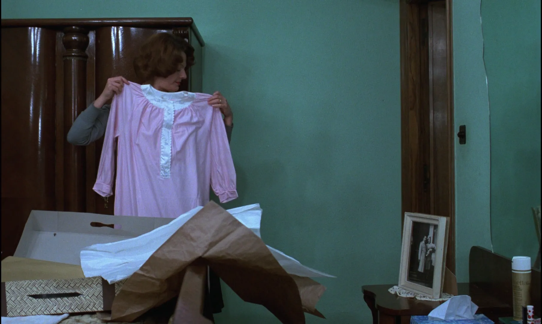当然阿克曼还保持着善意,当一排妇女从商场扶梯上下来,都穿着让娜·迪尔曼同款式的外套,其中一个还朝摄影机笑了笑,她们是让娜·迪尔曼的源泉,也是家庭妇女更普遍的样子。在家楼下,让娜·迪尔曼得到了一件礼物,是“费南多婶婶”寄给她的一条粉色睡裙,再次观看的时候,我感到这真是珍贵的物件,如果它在上午来到,就可以填补那些空虚,但是,谁也无法将顺序凑得这么好。而她走进厨房,从抽屉里拿剪刀去拆礼包的机位,又是那个不安的角度——从阳台看过来的正面。就在她拆了礼物包装,拿起裙子来比的时候,门铃又响起,嫖客来了。