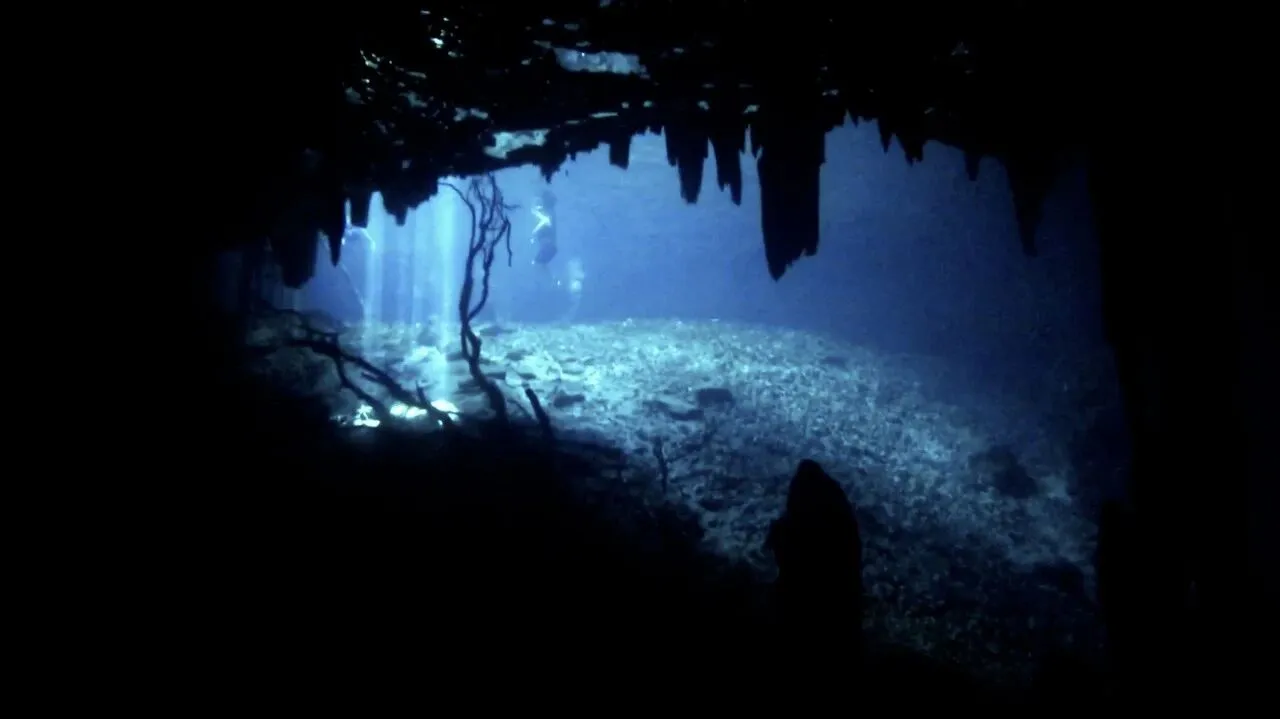 投影的影像基本都是我过去拍摄的素材。首先有做调研的人提供信息,供我们从中选择,决定要去哪里,然后就是实地考察。潜下去倒是没问题,但是进到洞窟或废弃的地下空间,发现基本上除了蝙蝠以外没有任何东西在活动。那里一片漆黑,不打光就什么也看不见。一旦设置好摄影机开始拍摄,我发现没有东西在运动,也没有风,影像中的时间就不会流动。因为不打算移动摄影机本身,比如大幅度的横摇或竖摇,所以当我在想要有一些运动时,投影的想法出现了。比如在其中一个地下空间,我想表现「这里曾经是海洋」,就尝试了投影鱼和海龟的影像。