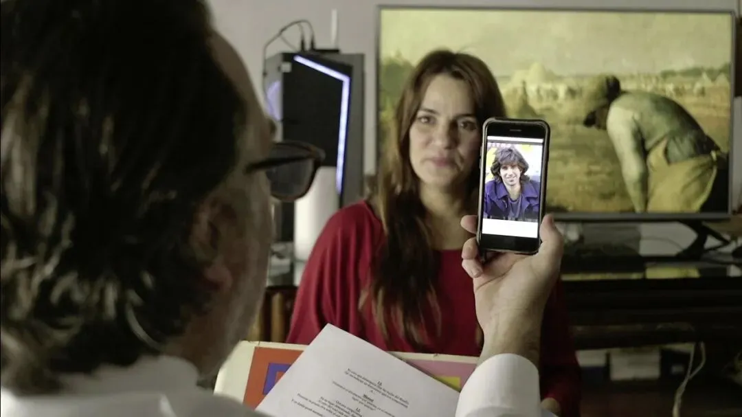 这种色彩的“角色扮演”很快超越感官,变为电影制作的剧场。利纳斯在这里延续了他从《花》[La Flor, 2018]起就开始实践的电影速写艺术:一系列短小、紧凑的场景(拍摄于潘佩罗小组的办公室),由演员穿着简单的戏服完成。它们无法构成完整的情境,但足以令原始的灵感显现出来。在这里,演员皮拉尔·甘博亚[Pilar Gamboa]和玛利亚·维拉[Maria Villar]分别饰演朱莉安娜·拉菲特[“蒙东戈”二人之一]和伊顿的性转“变体”(本文作者的推测)。利纳斯则一本正经地演出着弗里茨·朗,但不完全是作为一个角色,而更像是一种对艺术暴君(“蒙东戈”们对利纳斯的指控)的机械模仿——导演的眼睑卖力地固定着朗标志性的单片镜。两位女演员承担着虚构重演的任务,但毫无疑问仍以自身的姿态出现在银幕前。尽管如此,戏服让她们的存在唤起了不同的角色(我们也看到了换装的过程),这种整体性不比“纯粹色彩”更加神秘。展示演员的思想、排练、玩弄文本自身,正是因为相信电影是一门能够自我思考的艺术。