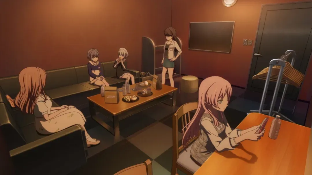 阴雨天。信号灯更改,踩踏在马路上的积水处,一只黑色的蝴蝶急匆匆地穿梭在行人之间。覆满雨滴的玻璃,焦距变化,随着一声长叹,贝斯手的面孔映在窗面。一道反切之后,虚拟摄影机的轨迹沿着带窗墙面的方向滑动,画面的朝向则是旋转了小半个圆角,焦点从练习室落地镜移向了即将打开的门口——练习室便如同一个装置舞台一般,只此一镜即揭开了整个世界的面貌。那只黑色蝴蝶所属的主人的入室,也将窗外的阴雨天带进了室内,无情的话语洒落在每一个人的心头。《BanG Dream! It's MyGO!!!!!》(以下简称为“《MyGO》”)的开篇,即以如此沉重的方式宣告了一个“命运共同体”的解散,为整部作品铺上了一层阴云。