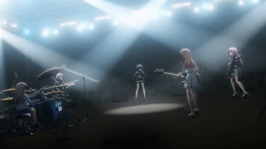 《FILM LIVE》与本篇动画中的虚拟演唱会部分都展现了来自动画创作者们的强大的控制力,但如果将其视为一场真正的“演唱会”,单是其演出音源全部采用配音、录音室歌曲,这样人造的必然而非偶发,从根本上就是令人兴致索然的。然而两年后的《BanG Dream! FILM LIVE 2nd Stage》[2021]却并没有另辟蹊径,而是继续沿着虚构的路走到了极致:真人演出现场所无法复现的镜头调度和非现实的动作、互动,对现实时间的强调,以及虽然依然是被创造出来的,但已有别于录音室版本歌曲、充满“临场感”的现场收音音色,无不让观众大呼过瘾。究其原因,则不可避免地回到了针对动画本体的讨论上来。