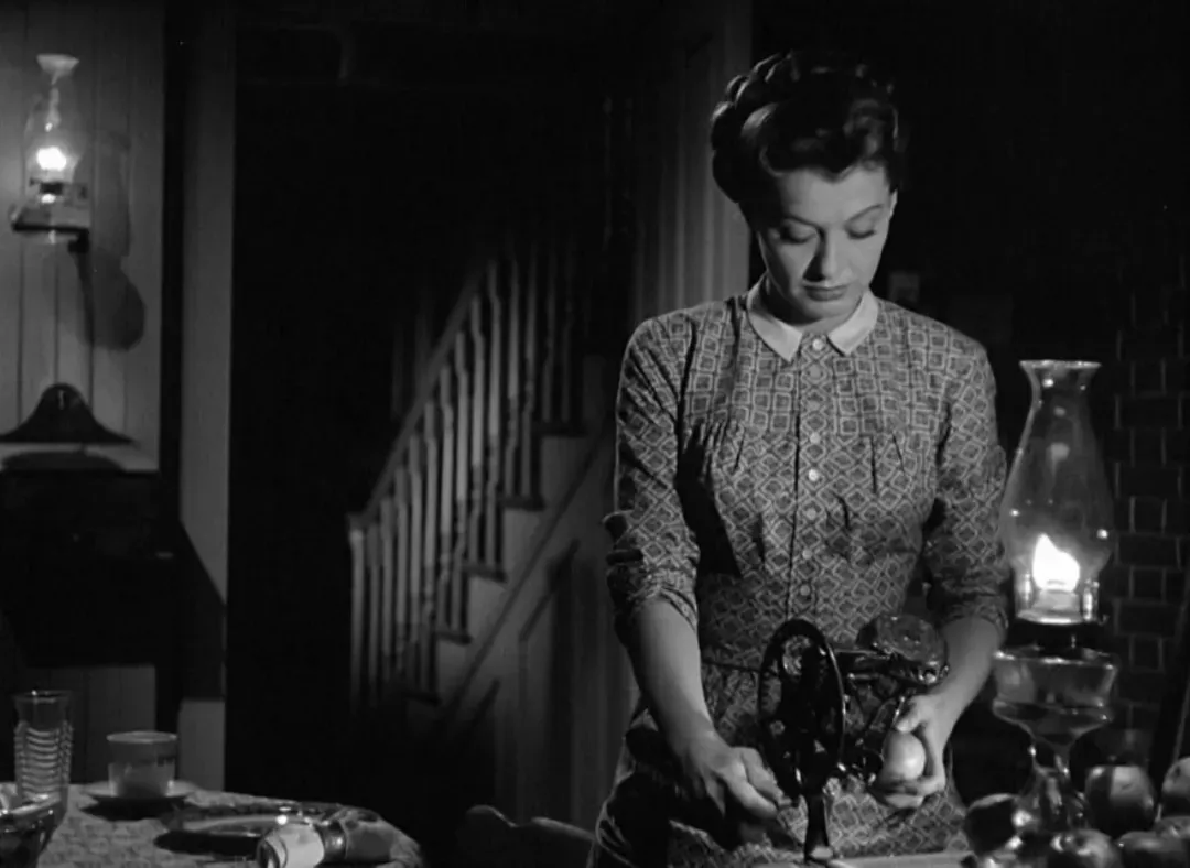 让我们暂时离开《狂野时代》,回想一下雅克·特纳在《侠骨慈航》[Stars in My Crown, 1950]中做了什么吧。艾伦·德鲁摆弄着削皮机,乔尔·麦克雷走进厨房向她倾诉传染病给小镇带来的恐怖。那一场戏里,整个厨房被难掩的担忧笼罩,厨房门则一直开着。特纳在每一次调度的变化内,都没有忘记这扇未被关上的门(除了在乔尔·麦克雷说出那句宣言“我们非得找出传染源不可”时,一个简单的推轨镜头让我们暂且忘记了门的存在)。而每当情境中出现来自疾病的无可挽回的恐惧,那扇门都会向我们传达一种作为电影内材料的焦虑。直到泰德先生前来拜访,艾伦·德鲁才首先跨越了那扇门。