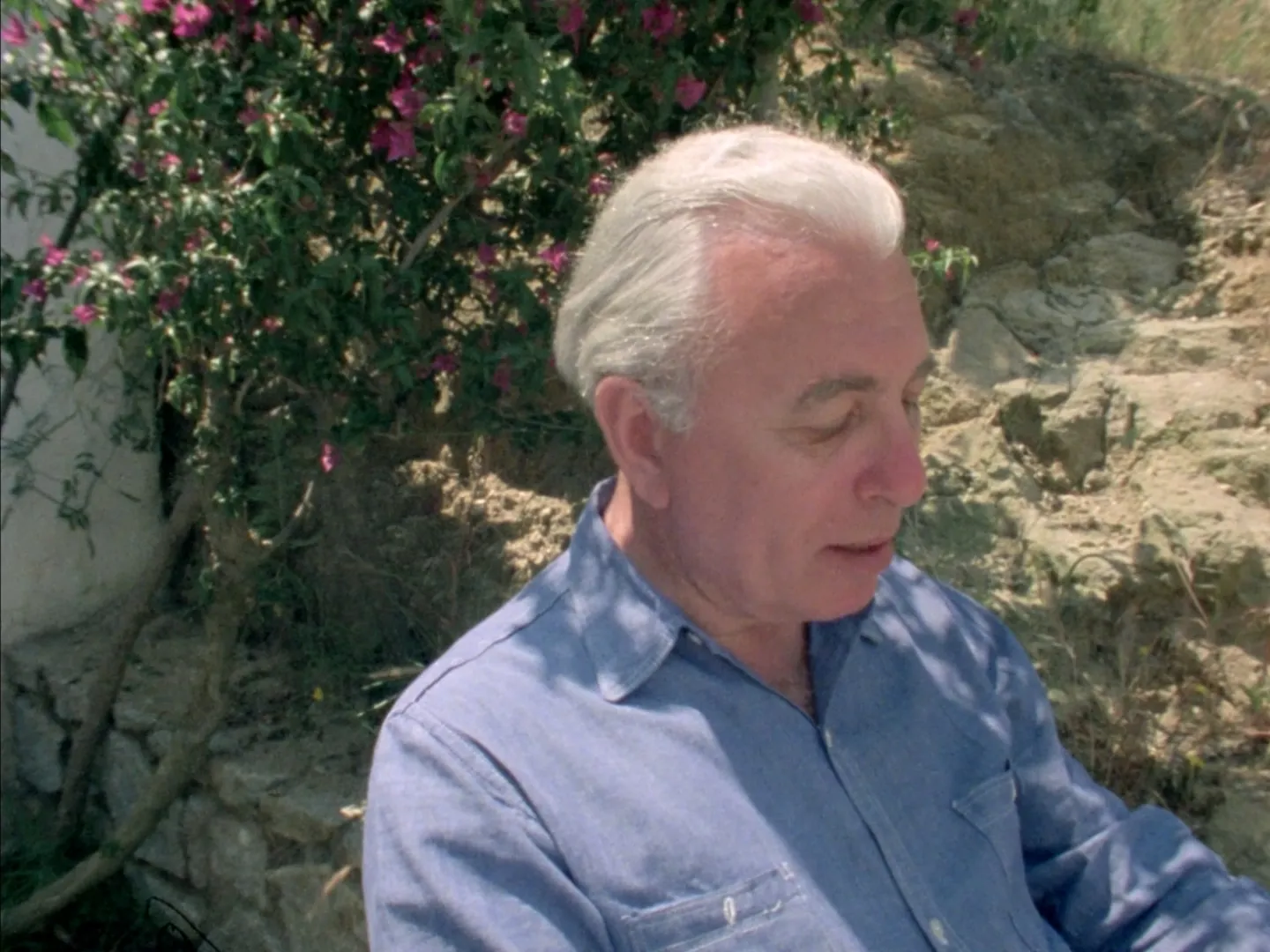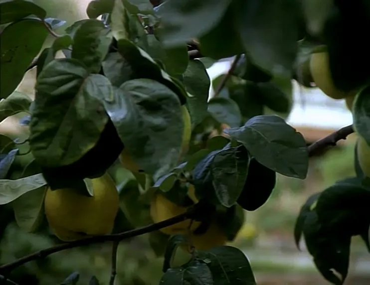 不稍一会儿,他走出屋子,径直走向院子⋯⋯那是一个背拍安东尼奥的全景镜头,摄影机的角度略高,俯拍着画家和他身前首次出现的那棵榅桲树(我甚至怀疑艾里斯选择将机器的位置摆放在了屋子门口的台阶上,也即安东尼奥走出屋子时的那个“刚开始”的位置,他曾在那儿驻足了良久),二者站立在一块,似乎作为一个可能的主题融为一个整体。只是,再下一个镜头,视点发生了转变,我们的目光被艾里斯的摄影机放置在了榅桲树稀稀疏疏的枝条上。一些绿叶和黄色的果实处于前景的位置,安东尼奥的脸庞第一次以近距离的、清晰的面貌被我们所目睹。