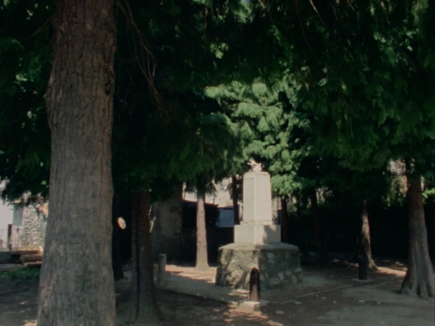 拍摄一棵树有一万种方法,一位作者却只能选择唯一的那一个。然而于伊耶–斯特劳布[Huillet-Straub,以下简称H-S]选择了最“好”,也最“正确”的方法。在“此”之前,一个360度的环绕镜头,映入眼帘的是几棵树木,些许建筑,目光最终回到满眼绿色底下的那块雕塑上;我们被置于一个具体的空间的中心,风景注视着你,打量着你,尝试不将你理解为某个例外的存在——摄影机就这样被世界的一切事物观看(只有H-S的电影真正做到了这一点,杨索[Miklós Jancsó]的电影无疑是其决绝驳斥的反面),以一个前所未有的视点。在“此”之后,映入眼帘的首先是雕塑上被篆刻的几行文字,一个向上的摇镜头(这在H-S电影内的确较为罕有),摄影机于一个新的视角重新观看那几棵沉默的树木,如同它重新观看那座雕塑,并尝试以阅读其中文字的方式再度理解它:“VINCA——胜利;RICORDI——纪念”。