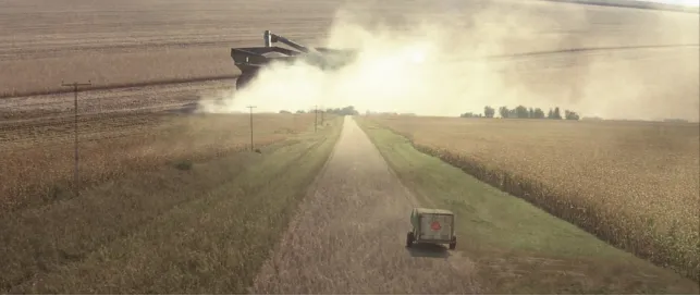 240英里,开车实际上只需要五个小时的路程,史崔特先生在割草机上用了六周的时间,行进的速度超乎想象地缓慢。电影是如何度过这六周的时间的?途中有波折和休憩,有娓娓道来的故事,也有长久的沉默。镜头只是一次又一次耐心地抚过丰收的田野和公路的蜿蜒,中西部农业州的旧日图景与驾驶着割草机的年迈身影相互叠印,悠扬的民谣轻轻托起乡愁。在了无遮蔽的天地间,旅行者的身躯体认着季节轮替和天气无常。时间用以丈量土地,比数字所能够衡量的更加漫长。割草机是旅途中诚实的伙伴,它与土地的关系最亲近,也最能够体谅人的衰老。它提供迟缓却可靠的速度,在漫长的路途中变成人所仰赖的速度,也是生存和情感所需寓居于其中的速度。