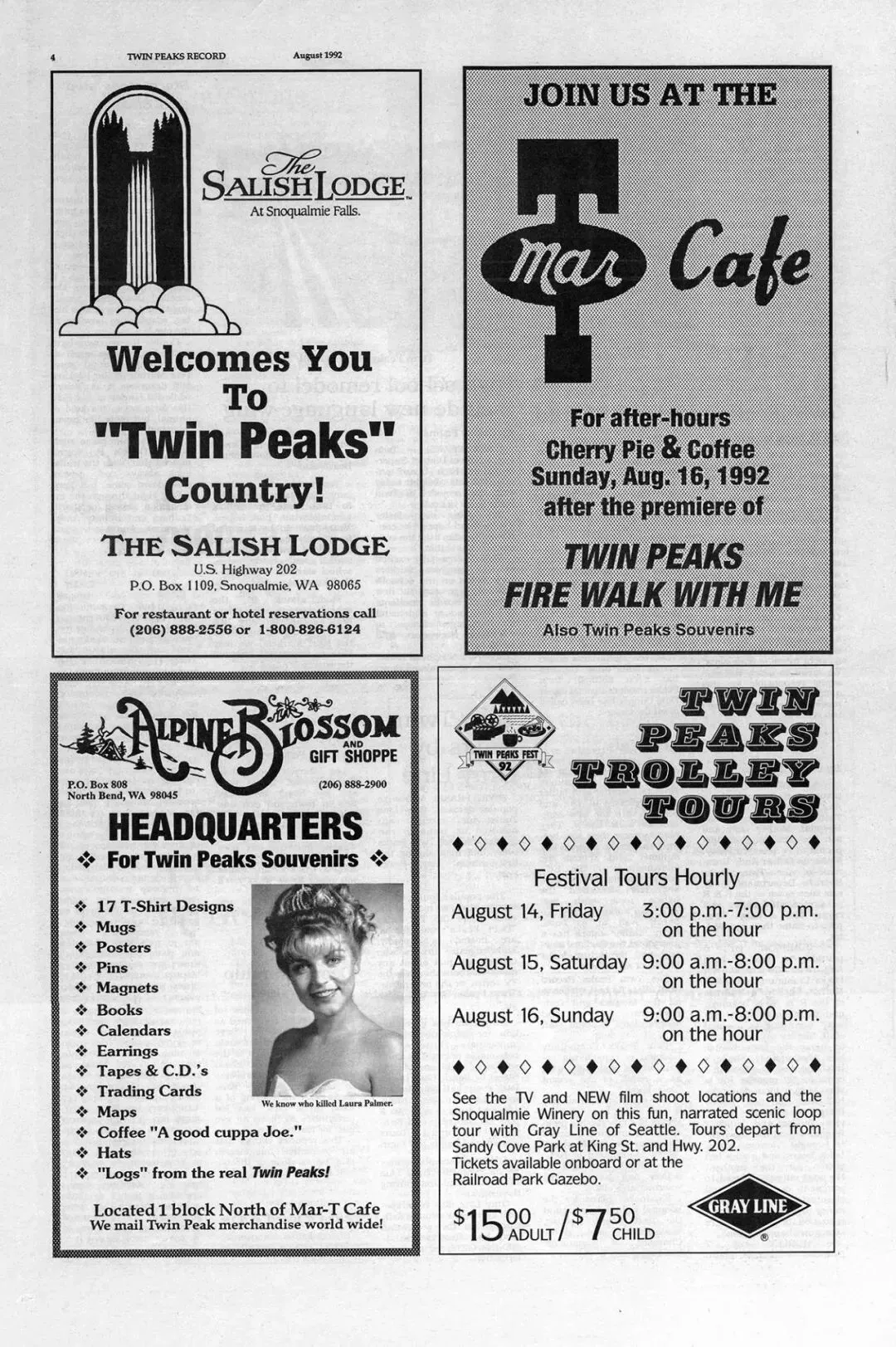 @WTTP:我找到的内容其实比较有限,但最好玩的是1992年日本人给劳拉[Laura Palmer]办的追悼会,他们甚至做了一个劳拉的模型!而且《双峰:与火同行》[Twin Peaks: Fire Walk With Me, 1992]的剧组曾经去过日本宣传,当时有很多杂志和影像,凯尔·麦克拉克伦[Kyle MacLachlan]也在日本拍了一些列广告和综艺。然后前几天从一个帖子里看到,说《樱桃小丸子》[『ちびまる子ちゃん』]的其中一集,电视上放的其实是《双峰》的标志。