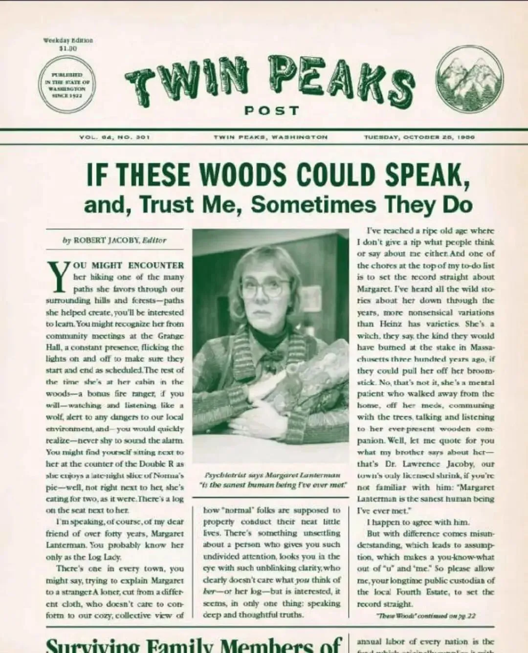 诺玛这个词在拉丁语里有“规范”的意思,她的饰演者佩吉·利普顿[Peggy Lipton]也提到了这个,她说相对于剧里其他一些角色,诺玛给人一种很稳重(稳定)的感觉。不知道是不是因为自动代入了诺玛的形象,我看那篇采访时,觉得利普顿也很有诺玛的气质,记者反复问她《双峰》的节奏是不是太慢了,不适合所有人,但是她非常坚定地表示,我们都有责任去接受这种冥想式的节奏(大致意思)。另外,我觉得还有一个地方被藏起来了,就是 Bookhouse,第一季第二季以及《神秘史》《秘密日记》,都着重描述了 Bookhouse,还提到了露西[Lucy Moran]买了很多书因此得以加入,话说露西还吐槽过,Bookhouse Boys 这个团体名太不合理了,印象里金米·罗伯特森[Kimmy Robertson]还录了视频,太可爱了!但是第三季就没有提到 Bookhouse,尽管我觉得 Bookhouse Boys 这个组织应该还在。