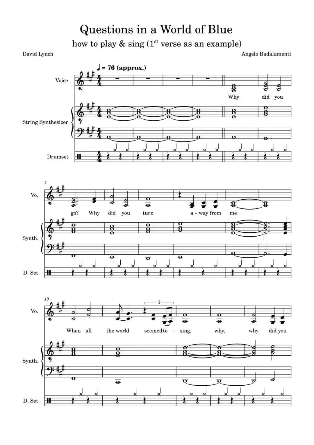 石新雨:找了一个会音乐的朋友看了看,他说是的!只是一个B大调,一个A大调,他说“Questions in a world of blue ”的特点,是钢琴和弦乐重叠在一起,这个写法并不常见,在卡萨维茨那里也比较明显。他说:“这是一种做梦的音乐,我会想到像《爱的激流》[Love Streams, 1984],它最后的场景里有一大堆乐器,都在演奏差不多的东西,全部重叠在一起,有一种很孩子气的感觉。如果放在正统的古典乐的评价标准里,这么做其实比较糟糕,显得你不知道怎么去写音乐,但是在这里,它是一种做梦的音乐。我觉得安哲罗的音乐真的跟林奇很搭,就是又老套又激进又优雅,并且很幽默。”