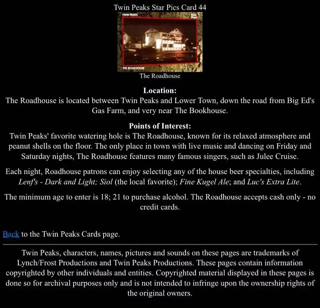 @WTTP:我很喜欢 Roadhouse 是另一个红房间的这个解释!或者说它和红房间是相连的。关于那个打扫的段落补充一下,在双峰卡片上,Roadhouse 那张卡里特意写了“它以放松的氛围和满地的花生壳而闻名”。
