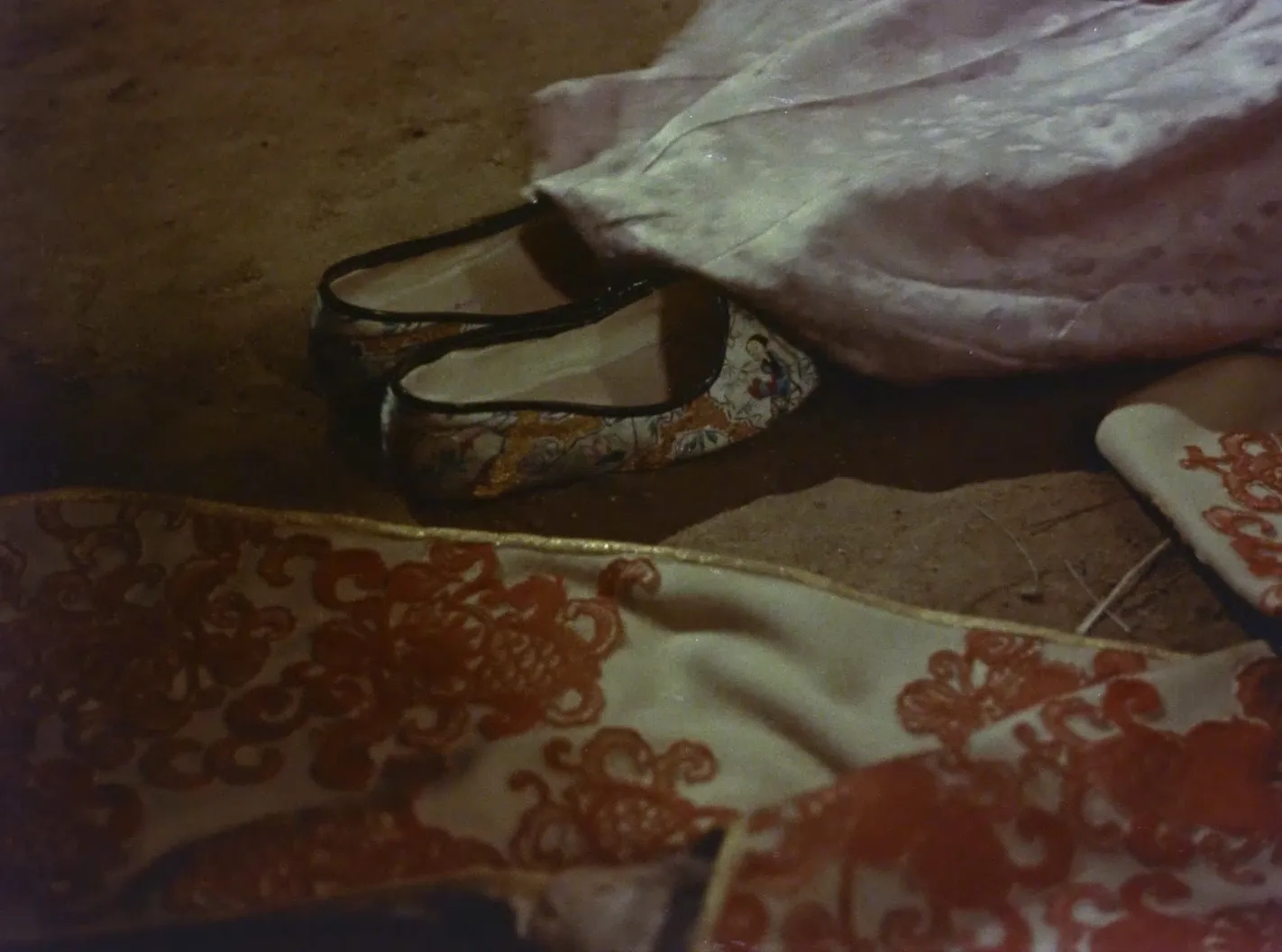 在《山椒大夫》中,母亲的歌声则构成了另一种非人的呼唤。玉木对儿女的思念过于强烈,以至于她的歌声脱离了她的身体,飘过海洋传到了安寿的耳中。在这个场景中,歌声渐渐脱离了歌唱者在场的身体,转而萦绕在安寿的耳边。镜头跟随安寿慢慢行至房间的角落,最终坐倒在地,眼睛望向画框外部。在《杨贵妃》中贵妃与玄宗初遇的场景中,贵妃也是跪坐在地,注视着画框外,聆听玄宗的琴声。在这些场景中,与若狭的呼声相似,人的存在脱离了他们身体的在场,转而变为一种曲调,而这些曲调比任何动作、表情都有力,直接地传达着角色存在的风格。