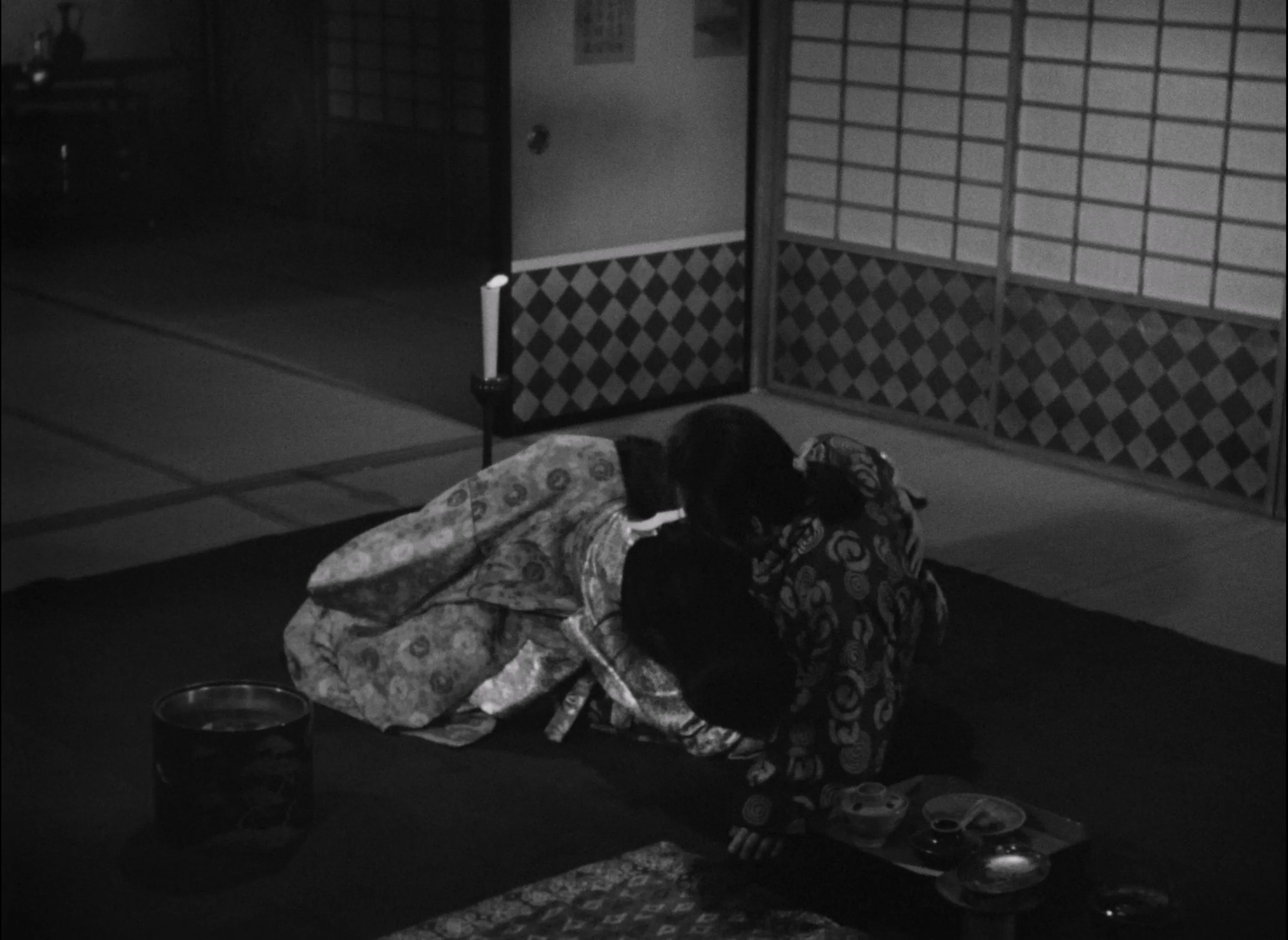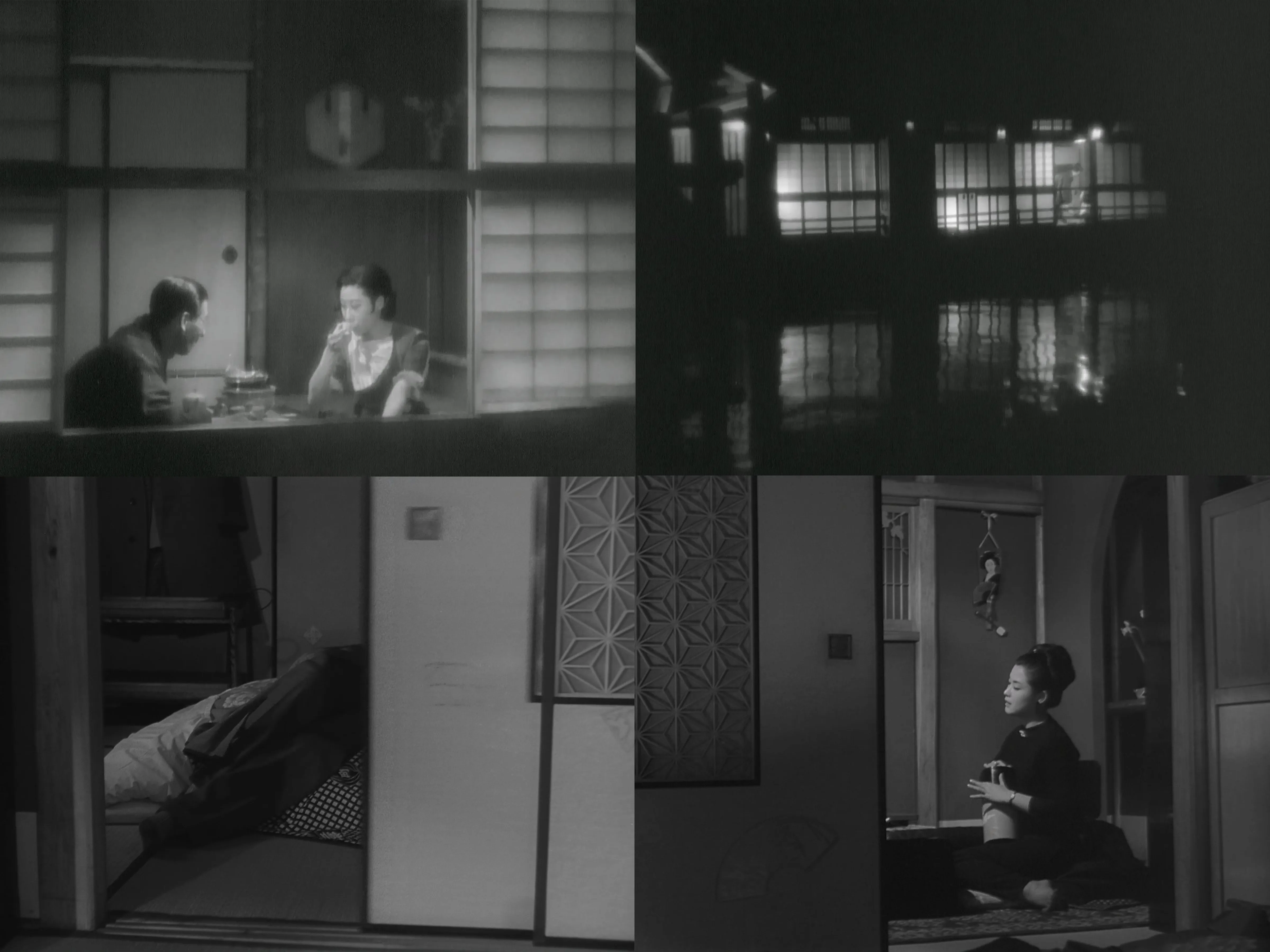 首先,对摄影机的“自觉”进行说明。在《浪华悲歌》中,摄影机经常被放置在门或窗的另一侧,其中有代表性的镜头就是绫子在河边饭店与藤野相会时,镜头一开始放在一个窗边窥视的位置,而一旦两人开始争吵,镜头就来到了一个非常遥远、看不清两人活动的位置。另外一个例子是在《赤线地带》[赤線地帯, 1956]中,存在着安美和客人进入寝室以后关上推门的动作,还有安美向着佣人讲述自己的身世的镜头。在这些场景中,摄影机要么是自觉地远离了那些似乎不应该被窥视的事情,或是自觉地留在门窗外,并不打扰人物所处的空间,就算人物出于各种目的拒绝了这种观看,摄影机也绝不会违反原则,跨过门与窗的界限去进行观看。就算是在《浪华悲歌》的近乎透明的西式公寓中,摄影机的摆放似乎仍然维持着这种原则,空间的联通似乎正是为了将其遮断而存在的。这是沟口与成濑截然相反的地方,在成濑的作品中,门与窗的构图往往代表着人物受到的来自内心或者社会的禁锢,这种构图是隐喻性质的,或者说隐喻式的;而沟口的此类构图始终是表层的,它恰恰拒绝了那种对人物心理状态的外化,成为了人物不可见的内在性的体现。也就是说,这种对看与不看的选择恰恰从与可见性相关联的目光过渡到了目光抵达人物内心的不可能性。