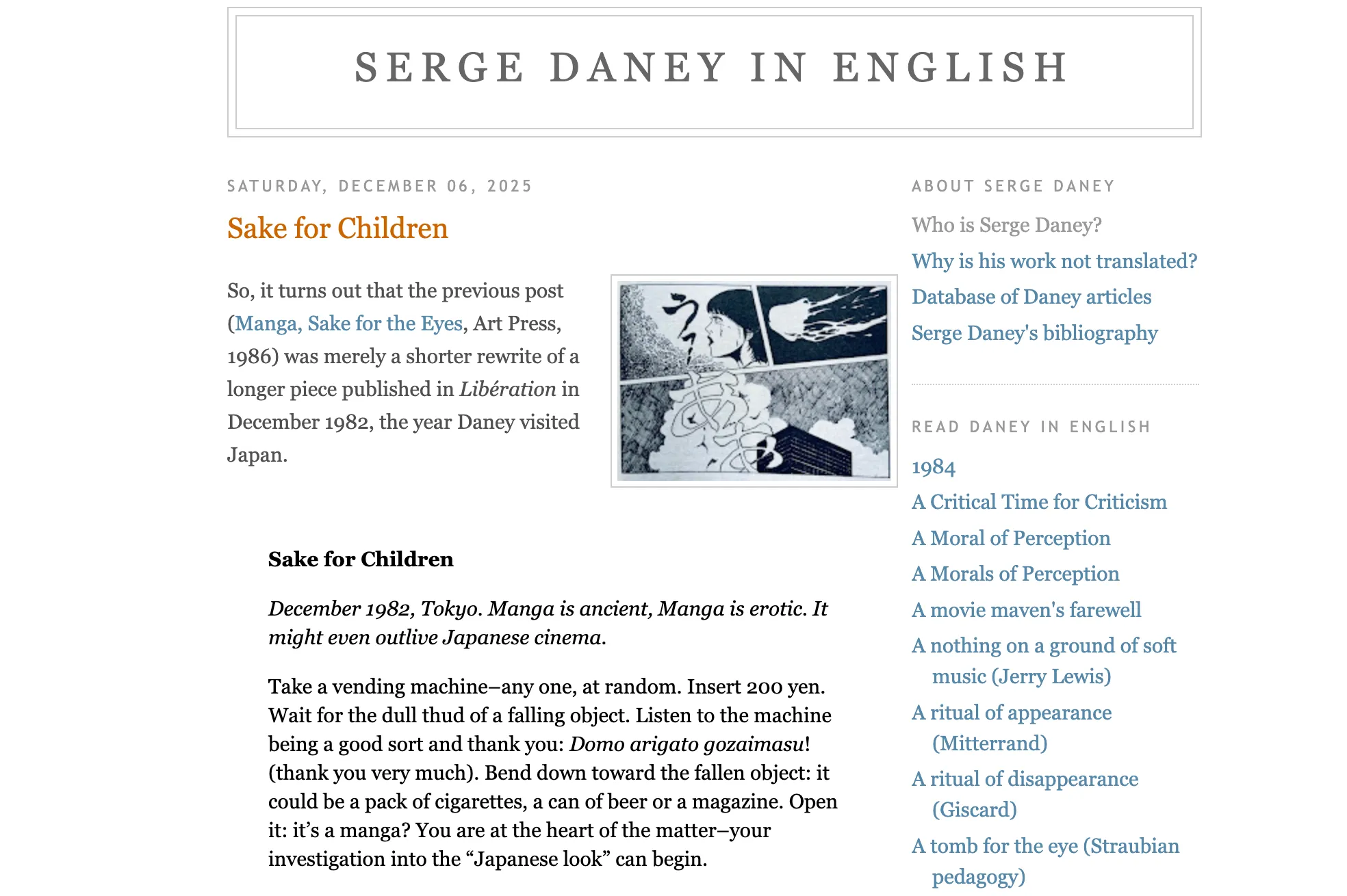 以下的整理只是冰山一角,但很难想象如果没有了洛朗·克雷茨施马尔[Laurent Kretzschmar]的Serge Daney in English [https://sergedaney.blogspot.com/,需科学上网],以及斯托菲尔·德布塞雷[Stoffel Debuysere]的Diagonal Thoughts [https://www.diagonalthoughts.com/]这两个网站的存在,英文(以及包括中文等非法文)世界的“达内研究”会倒退多少年。类似的还有英文世界中专注于整理和译介雅克·里维特相关文章的Order of the Exile [http://www.dvdbeaver.com/rivette/ok/writing.html];另一边,在来自印度的影迷“Just Another Film Buff”的个人博客The Seventh Art [https://theseventhart.info]上,能找到他翻译的大量吕克·慕莱[Luc Moullet]的评论著作(以及更多内容)。
