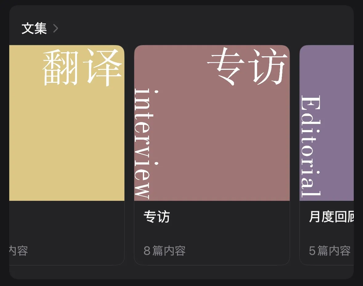 竖屏对于排版的限制自是不用说。竖屏推送、每天只能推送一次且以单篇为主——这种基于时间轴的线性信息流并不利于检索,也使得文章间的关系很难呈现为并列或非线性的。单篇推送内部是单一层级,多篇推送之间也没有好的标签分类机制。公众号主页的合集下拉菜单只能纵向地按照「评论」「翻译」「专访」等板块进行分类,但当我们想要在内容之间进行横向跳跃(如某个主题、某位导演或某期展映相关)就显得力有不逮。而豆瓣很晚才加入的Selects功能也难以进行复合逻辑的分类,并且因为显示范围有限,要放置多个分类也会导致页面缺乏条理,浏览起来不够清晰。诸如此类的特征(当然还有审查机制),使公众号和豆瓣都难以对内容进行更丰富的呈现和更细致的归档留存。