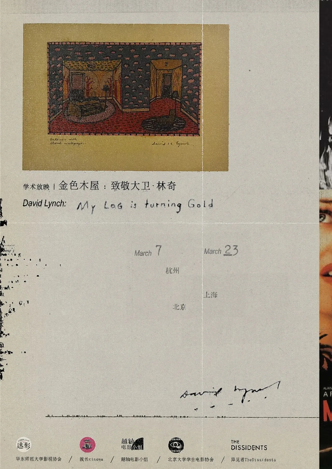这几乎是不可能完成的事情——只需看看展映总结推送末尾超长的参与·致谢名单。学术放映渠道、各地影迷的协助、大量的时间和劳作缺一不可。在展映落地的过程中,我们收到很多主动希望帮忙的提议,同样也因感受到更多人对林奇的喜爱而发出邀请。我想,无需强调林奇带给我们怎样的影响,《双峰》里因为一场死亡发生的情感传递早已实在地改变着我们的期许。这是一次属于朋友们的电影展。我们组织起更多的环节,与其说是出于责任,不如说更是出于热情和邀请的愿望。我们希望这次展映有容纳每位朋友的位置,也发现自己所做的事情,恰是因为身处于整体的某个位置,找到了自身的意义。