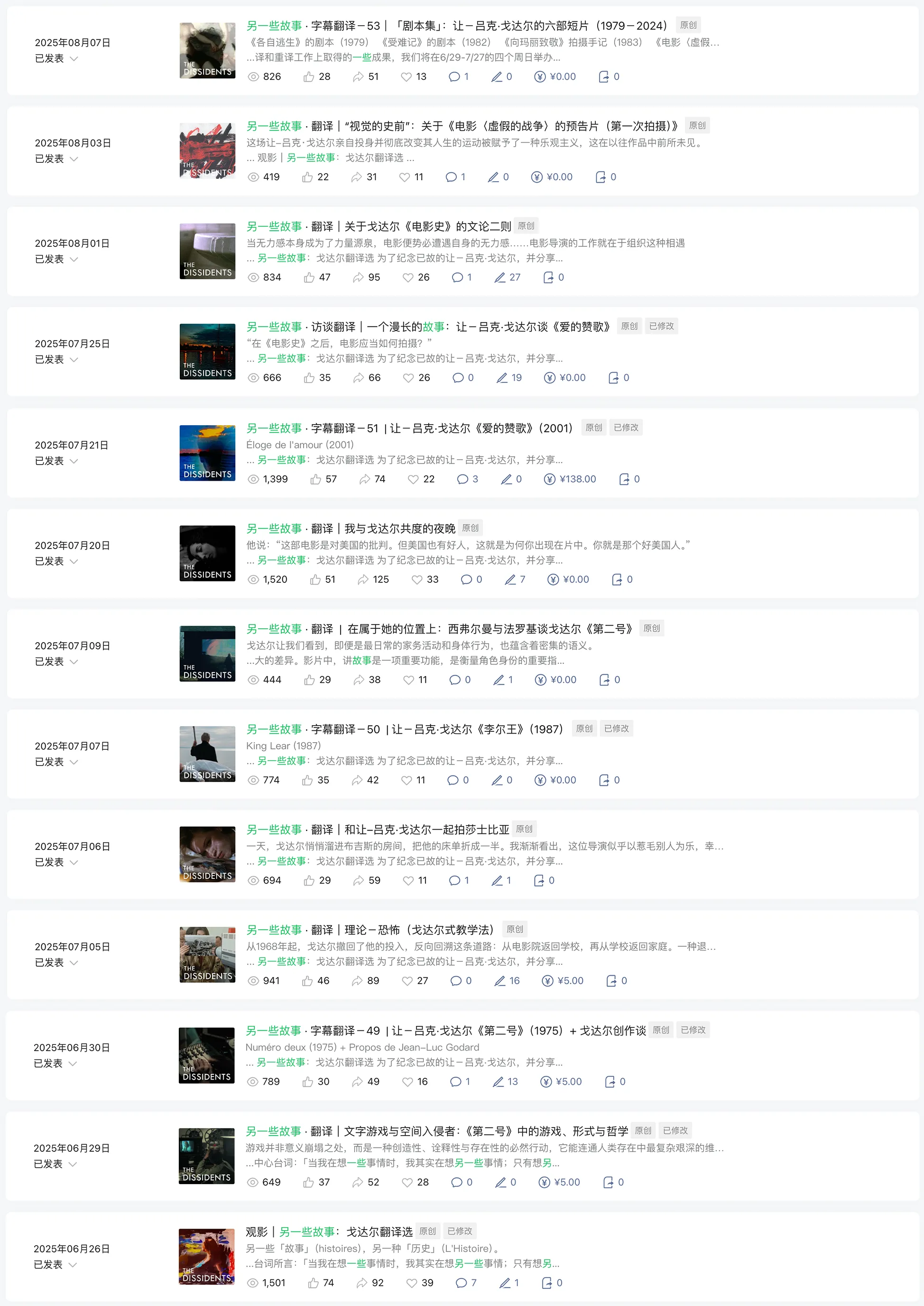 以上仅是一些对于自媒体组织形式的较为理想和朴素的愿景。实际上,异见者始终面临着很多更为现实的问题。因为平时大家需要兼顾个人生活,写作只是为爱发电,能够持续进行写作的只有寥寥数位成员。而且很多文章篇幅过长,写作时间也较长,一些零碎的想法可能会因为没有合适的位置而被放弃。我们整体都缺少更为“轻松”、可持续的写作,和更为轻量的体裁。而最重要的是,这样一个影迷兴趣小组的模式也导致每篇文章之间的关系都较为独立,甚至可以说十分松散。除了成员凭个人兴趣坚持写作的系列,如desi的「洪常秀笔记」,TWY的潘佩罗小组系列文章,和涵盖范围有限的「戛纳评论」单元,很少能够组织起系统化的内容呈现。