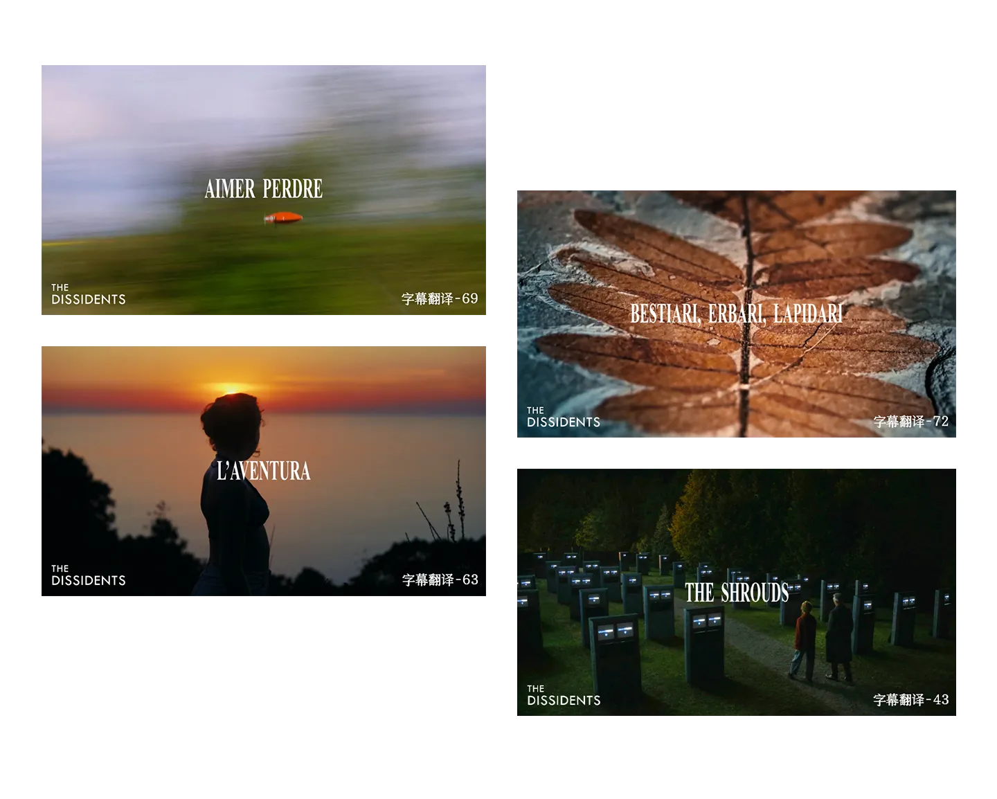 多亏翻译部各位译者的加入,今年是“异见者字幕翻译计划”产出最为丰富的一年。我们继续坚持前两年一以贯之的翻译选片策略。首先,是一些我们认为被主流忽视但十分重要的电影人的作品,包括编辑部长期关注的克拉莫、晚期戈达尔、林奇的冷门短片、于伊耶-斯特劳布,以及近两年刚刚被重新发现的迈克尔·罗梅尔等等;这类内容我们通常不仅会翻译影片字幕,也会译介一些相关资料文本(访谈、作者自述)配合传播。其次,则是新近流出资源的、来自世界各地电影节的小众艺术影片,它们通常会在各大字幕组的“抢翻译”竞争中被忽略,比较适合我们相对较长的翻译周期;这些影片中有许多都得到了异见者编辑部成员的一致好评,以至于我们今年的年度十佳片单中有四部由我们自己翻译字幕:《奇遇》[L’Aventura, 2025]《动物寓言集,植物标本集,化石集》[Bestiari, erbari, lapidari, 2024]《裹尸布》[The Shrouds, 2024]和《爱与输》[Aimer perdre, 2024]。其三,则是对一些字幕翻译质量较差的影片进行重译。今年,翻译部最引以为傲的成就之一,或许是重译了四部卡萨维蒂的主要作品,从《面孔》《醉酒的女人》《首演之夜》和《爱的激流》——令人难以置信的是,在我们发布重译字幕之前,这四部理应极为耳熟能详的经典影片在网络上却根本找不到一个可靠的字幕。最后,延续着我们一直以来对女性导演作品的支持,我们今年打捞并翻译了七位女性导演的电影遗珠,她们分别是:苏珊·桑塔格、罗丝·崔奇、苏珊·塞德尔曼、朱丽叶·贝尔托、玛丽·布隆斯坦、弗朗苏·普雷南和劳拉·穆尔维。