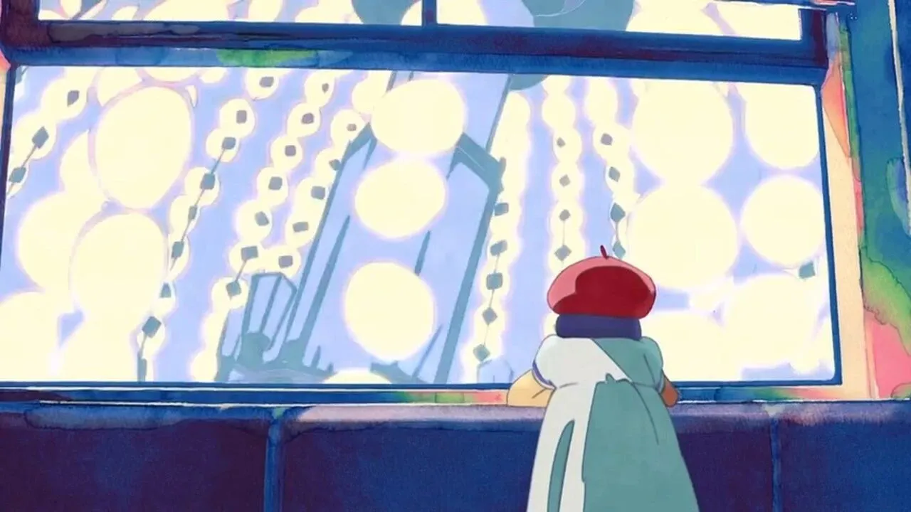 池袋站北检票口,一位小女孩望向站内的猫头鹰雕像,她的脚下滚来了半开的扭蛋。钻过了打扮成各色动画与漫画形象服饰的人们,她不知何时已经戴上了漫画家的红帽,迈着欢快的脚步一路小跑进眼前的林荫道。行进的列车中,女孩趴在列车的窗沿,眼前闪过了代表着这片区域的一切:路旁的街景、祭典的灯火、起舞的人群、水族馆内游动的企鹅⋯⋯终于,在已经不复存在的漫画家公寓内,她推开一扇门,那里是日复一日将心意倾注在作品上的漫画家手冢治虫。似是察觉到了身后的声响,漫画家回过头来,朝女孩露出了自己的笑容。