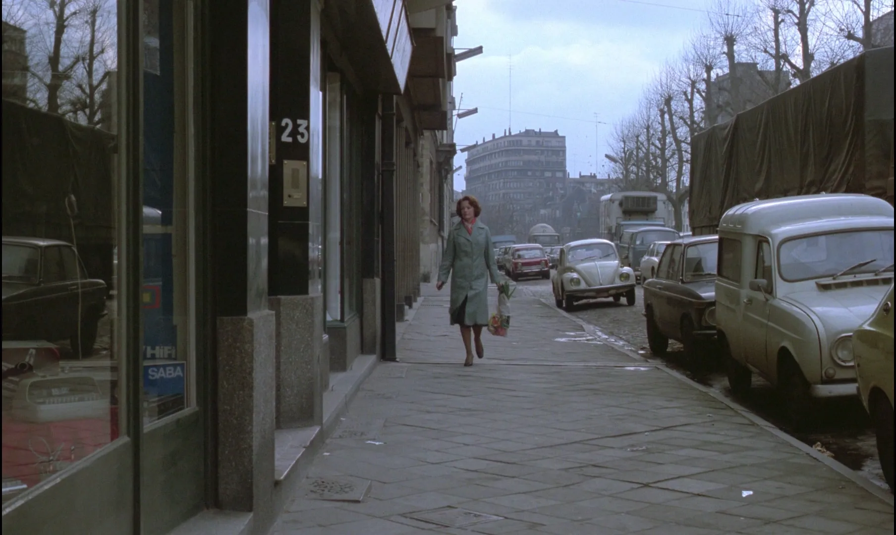 白天,她有一半时间在街区里。以上午为例,她去好邮局之后,我们隔着段马路,看她走进一家铺子,别的妇女也刚好从里面出来。接着切到下一条路上,她走过来,网格袋里多了好几样东西,又进入一家店铺。这个街区的早上,男人们大概在上班,在外头的大多是女人和孩子,遇到认识的,就寒暄几句。或许是由于距离的存在,我们不知道她们拿的一个个纸袋里,到底装着什么东西,就像看让娜·迪尔曼远远地走路,却不知她的内心活动,她是否一边在想闲事呢?观众会不会和她想到一块去呢?遐想的路和现实的地点交叉,网格袋从肉铺拎出,再拎进蔬菜铺,堆上了水果和绿叶菜,袋子越来越满,最后回到1080商业街23号。