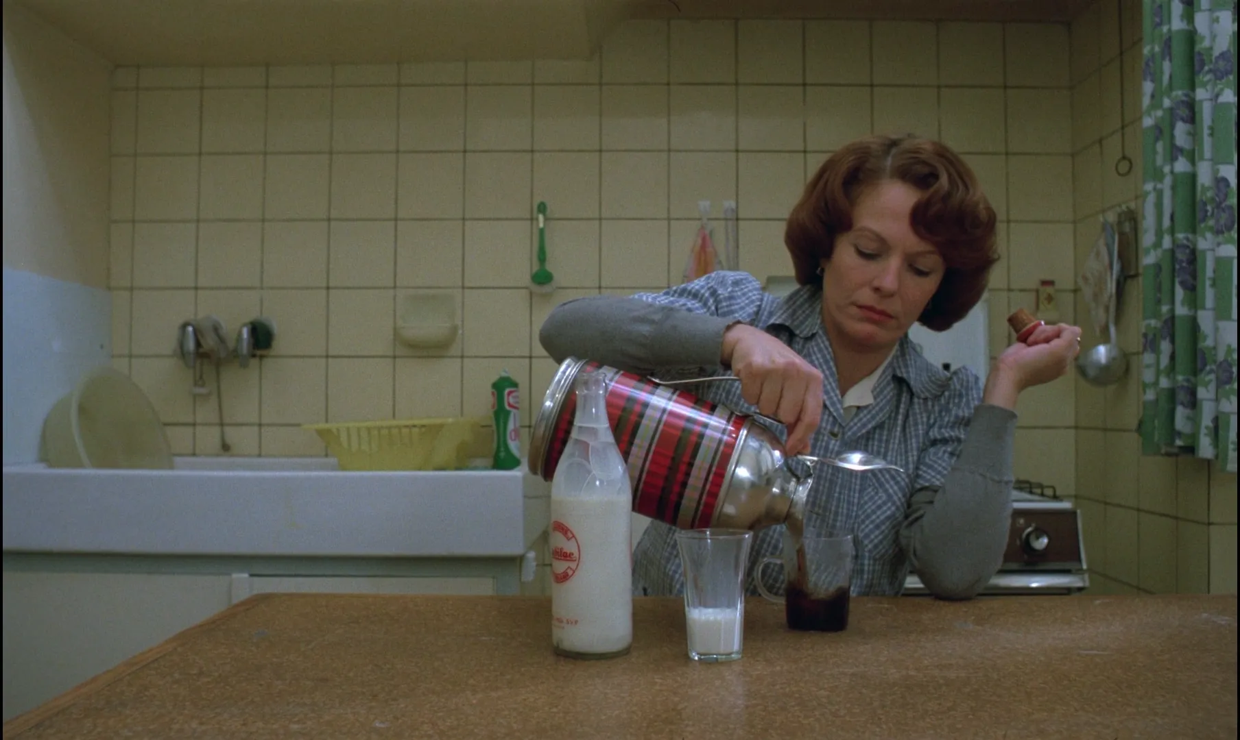 咖啡的味道出了错,或许是她今天太敏感,还是这个点本就不喝咖啡,于是她做了个实验,把原料排在桌上,反复比对再倒掉,重新做一壶。于是,在等汁液流进壶里的过程中,她又陷入了空虚。客厅的黄沙发上,她居中地坐着,机位离她太近或太远,因为一些空间被抽走了——一张桌子、一个水槽、一件要做的事。这种焦虑不只是心理,而是身体的无所适从,她不能在镜头前什么也不做,就突然站起来,把客厅壁橱里的盘子和娃娃都拿出来擦了一遍,又下楼看信箱,再无所事事地上楼。