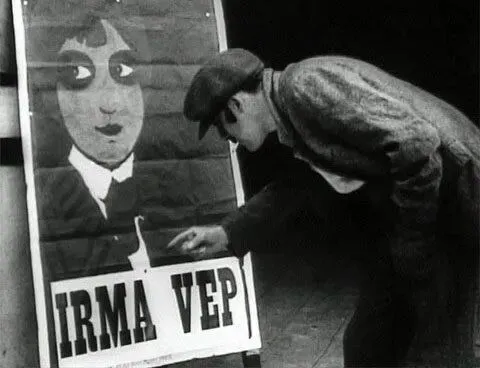 通过乔伊尼克的音乐,电影人找到了一个空间。实际上,他找到了几处交汇点来充当电影的画布。如果说利纳斯在蒙东戈的工作室里感到明显的“不自由”,那么这次他则在自己的王国展开反击。在开场,我们站在一家画廊门外,门上贴着一张“色彩艺术”展览的海报——我们走进一个音乐厅观看乔伊尼克的现场演出。但是,意外的转折已经出现了:路易·菲拉德[Louie Feuillade]的默片经典《吸血鬼》[Les Vampires, 1915-1916]被并置在一个框中框内,溯源了之前的场景——一个世纪前,一个相似的情境,一群观众站在一家舞厅的门外,门上贴着“伊尔玛·维普”[Irma Vep]的海报,而其中一名角色认出这是“吸血鬼”的变形词,而文字游戏也将在利纳斯的电影中到来。当我们进入剧院时,饰演伊尔玛·维普的女演员 Musidora 正以她的催眠表演迷住观众。通过“框中框”,菲拉德的电影被召唤成为另一个容器(它的黑白图像被染上了不同的数字色调);更确切地说,利纳斯的电影将自己与《吸血鬼》融合:我们进入的剧院通向两个地方,在连接两个历史和时间的纠缠中交汇。菲拉德的黑白图像时常闪现在画面中央,被周围的一圈纯色色块包围,就像伊顿书中展示“精神生理学上的色彩”时使用的灰色方块一样:灰色在蓝色包围下会呈现微红。对于利纳斯来说,《吸血鬼》是世界的反射器,是充满现实振动的虚构染料。