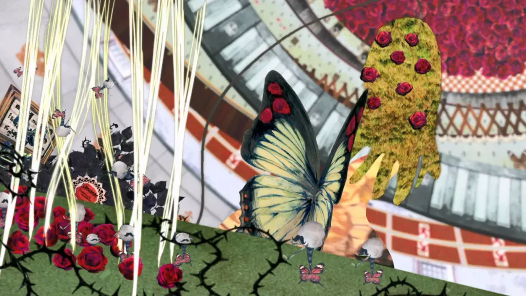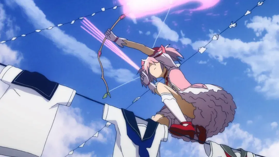 魔女世界中的建筑符号:蝴蝶,玫瑰,昆虫,电视,旧式卡通片式动物,药水,童话故事人物,音乐,校服短裙与晾衣绳:生活的、私人的、来自内部的事物。魔法少女进入战斗时的变身,则是一次富有色情媚俗性质的换装:幻想的、一厢情愿/缺乏自我意识的、几乎是来自外部注视的产物。她们的武器:火枪/炮,剑,长枪/三节棍,时间机器/爆炸物/散弹枪,弓箭:这里的美(我是说帅,但可惜它不纯粹,其中的媚俗被包裹在孩子气或者天真中,尤其令人忧伤)来自动作,魔法少女被迫进行的战斗无疑是与自我图像进行的暴烈悲剧性辩证运动;在第十集中,面对身穿校服的巨大魔女,魔法少女朝其裙底——看上去是裙底,但从中伸出来的却是手——扔出炸弹:一个怪异的场景,可以想象这或许会产生负面的解读,但无论如何这必然指向一种主体和自我的分裂斗争。