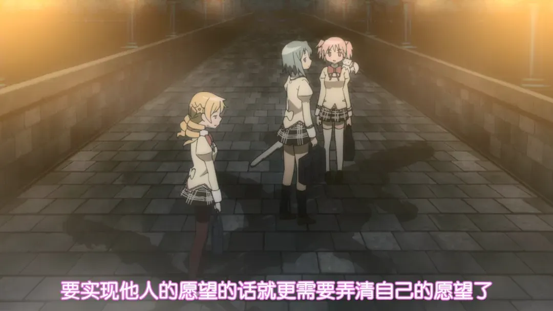 善恶与对错;“为了谁”的问题。 小圆向母亲提问:为什么做对的事情却得不到幸福?这太糟糕了。能有什么办法呢?母亲回答道:那么,有的时候做错就可以了,你或许可以补偿做对而产生的后果。与其说这是对魔法少女主要矛盾的一个暗示,不如说这提出了对错/善恶的浮动观念。与此相关的是“为了谁”而许下愿望或做出行动的问题。小爽用以立下契约的愿望是让恭介的手恢复正常,能够重新演奏小提琴;她认为这是一个无私的愿望,因此也从未向恭介告知真相。然而,当仁美向小爽坦白她对恭介的情感时,就像发生了一种照明角度的变换而破除了一个光学幻象那样,小爽突然明白她的愿望并非无私,而是一种令她不愿意相信的、令她难堪的混合物。这使她突然怨恨、并且惊恐于这一点,开始厌恶自己(在更后面,我们看见一种与之相关的心理:既避免自己成为“恩人”,又不愿意被人“拯救”)。她的立场表里不一,但问题不在于她的道德,而在于她误认了“私”(自我)的边界。杏子的故事可以用类似的方式理解。只要有这种不可避免的误认存在,善恶/对错就永远是实际上不可定义的浮动概念。