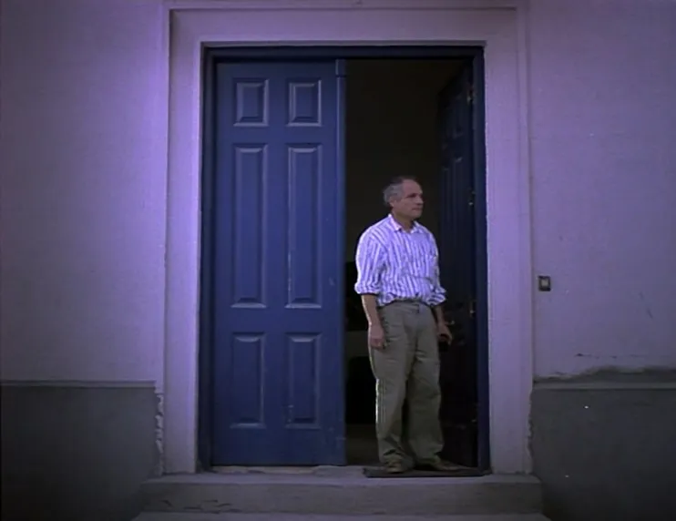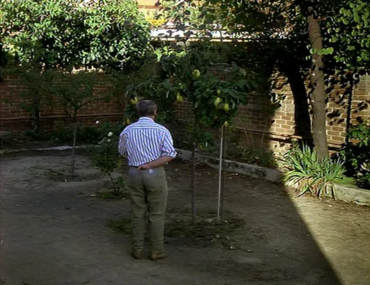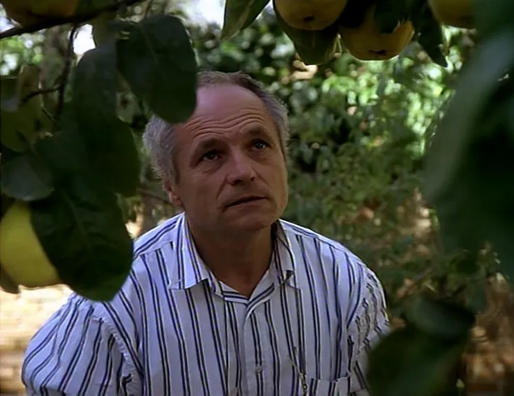 不稍一会儿,他走出屋子,径直走向院子⋯⋯那是一个背拍安东尼奥的全景镜头,摄影机的角度略高,俯拍着画家和他身前首次出现的那棵榅桲树(我甚至怀疑艾里斯选择将机器的位置摆放在了屋子门口的台阶上,也即安东尼奥走出屋子时的那个“刚开始”的位置,他曾在那儿驻足了良久),二者站立在一块,似乎作为一个可能的主题融为一个整体。只是,再下一个镜头,视点发生了转变,我们的目光被艾里斯的摄影机放置在了榅桲树稀稀疏疏的枝条上。一些绿叶和黄色的果实处于前景的位置,安东尼奥的脸庞第一次以近距离的、清晰的面貌被我们所目睹。