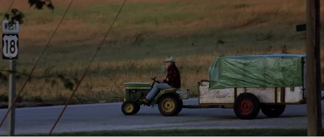 240英里,开车实际上只需要五个小时的路程,史崔特先生在割草机上用了六周的时间,行进的速度超乎想象地缓慢。电影是如何度过这六周的时间的?途中有波折和休憩,有娓娓道来的故事,也有长久的沉默。镜头只是一次又一次耐心地抚过丰收的田野和公路的蜿蜒,中西部农业州的旧日图景与驾驶着割草机的年迈身影相互叠印,悠扬的民谣轻轻托起乡愁。在了无遮蔽的天地间,旅行者的身躯体认着季节轮替和天气无常。时间用以丈量土地,比数字所能够衡量的更加漫长。割草机是旅途中诚实的伙伴,它与土地的关系最亲近,也最能够体谅人的衰老。它提供迟缓却可靠的速度,在漫长的路途中变成人所仰赖的速度,也是生存和情感所需寓居于其中的速度。