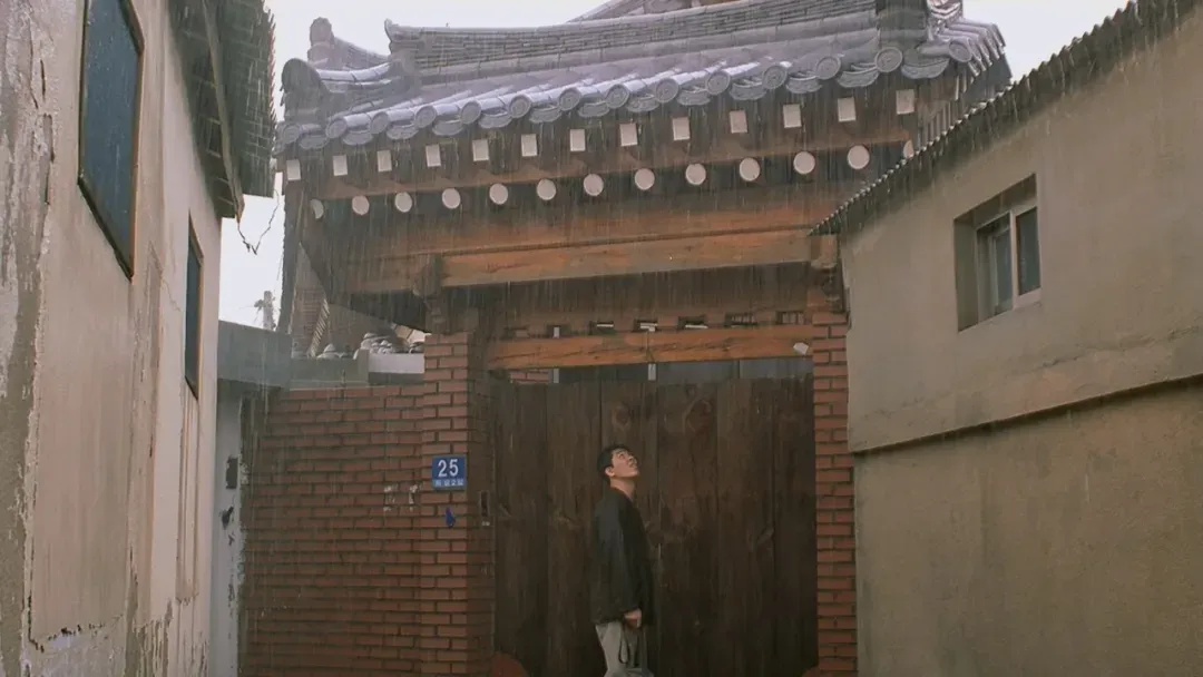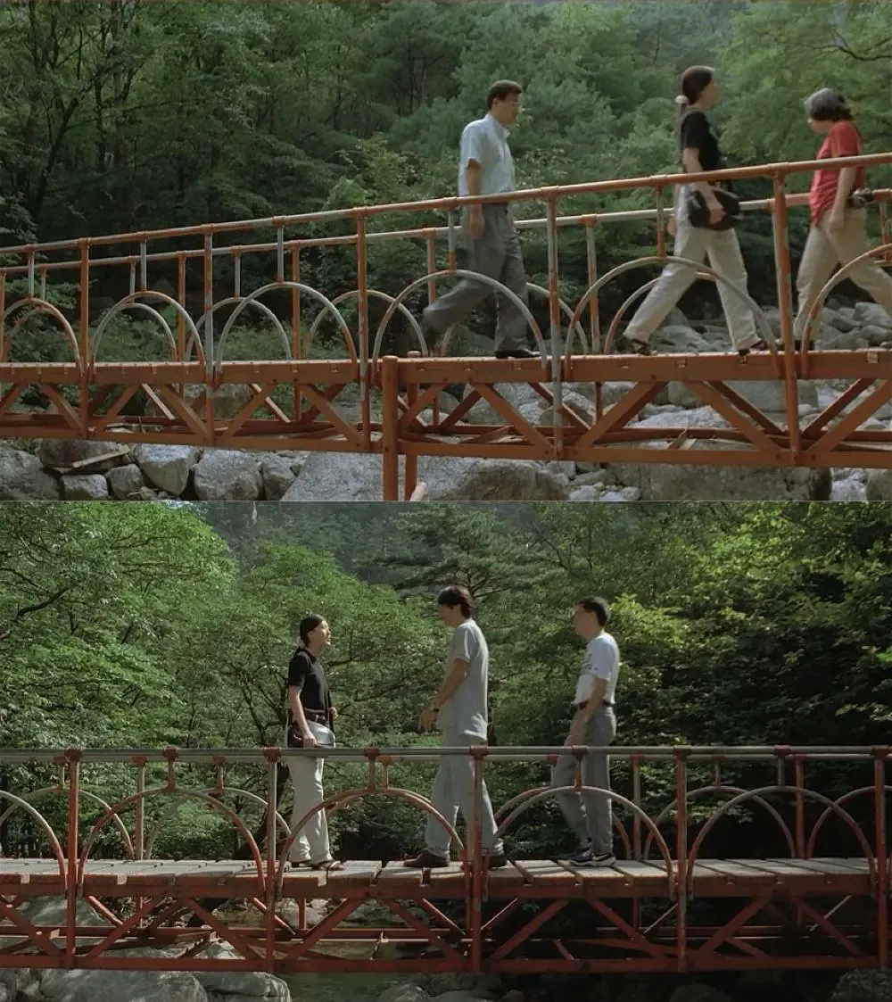 但是,回到四年前的《江原道之力》[강원도의 힘, 1998],我们也能看到一列火车和它引出的两段旅程。尽管两位主人公被车厢与人群阻隔而没有碰面,但两个故事的确在火车上邂逅了彼此,而后在江原道的山景与街巷中平行展开,直至结尾的再次汇合。然而区别的关键在于,这两位主人公并不是素不相识之人,而是一对关系陷入了僵局的情人——这正是影片故事结构的核心戏法。两个关联紧密的人同时同地出现,这便不再是一场普通的偶遇,而构成了一个巧合[coincidence]。巧合是一种偶然,但不是任何一种偶然都足以构成巧合。试想,我们什么时候才会把一个偶发事件称作一个巧合?当这个事件表现出一种与其随机本质毫不相称的规律性之时。火车上的两个陌生人产生交集 = 偶遇;两个熟人不约而同地去往同一个目的地 = 巧合。两人在旅途中各自遇到了某人 = 偶遇;两人遇到了同一个女人,而这个女人最终意外坠崖死亡 = 巧合。本质上,巧合与其说是小概率事件(概率论会告诉我们,一个所谓的巧合,与其对应的那些更“平庸”的样本点实际上是等可能的1),不如说是暗合于某种规律的事件。