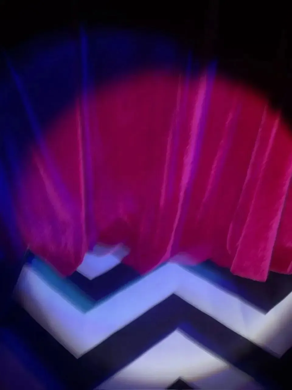 @WTTP:我网购了一块的红色丝绒幕布,然后用一种非常简陋的方式把它挂在了一个衣柜上(用柜子门的上缘夹住),再定制了一块大概120x120厘米大的黑白折线地板贴纸,组合起来。还买了个四色补光手电筒,尝试加了一下蓝光,如果关了灯打蓝光就会变成蓝丝绒!双峰蓝丝绒一体机,就是这样(如图)。有机会的话我想做一个有转角的。非常好玩。