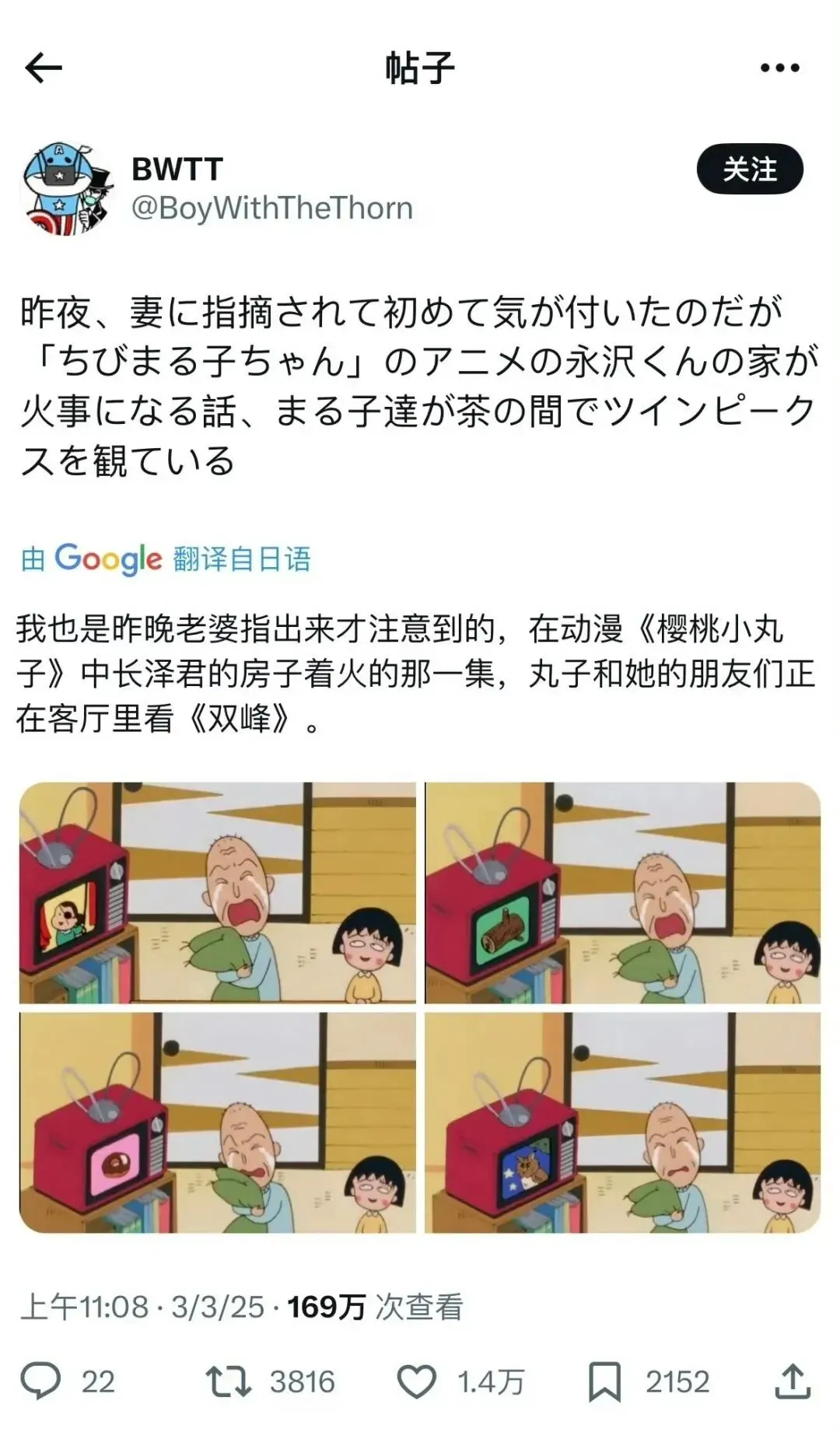 @WTTP:我找到的内容其实比较有限,但最好玩的是1992年日本人给劳拉[Laura Palmer]办的追悼会,他们甚至做了一个劳拉的模型!而且《双峰:与火同行》[Twin Peaks: Fire Walk With Me, 1992]的剧组曾经去过日本宣传,当时有很多杂志和影像,凯尔·麦克拉克伦[Kyle MacLachlan]也在日本拍了一些列广告和综艺。然后前几天从一个帖子里看到,说《樱桃小丸子》[『ちびまる子ちゃん』]的其中一集,电视上放的其实是《双峰》的标志。
