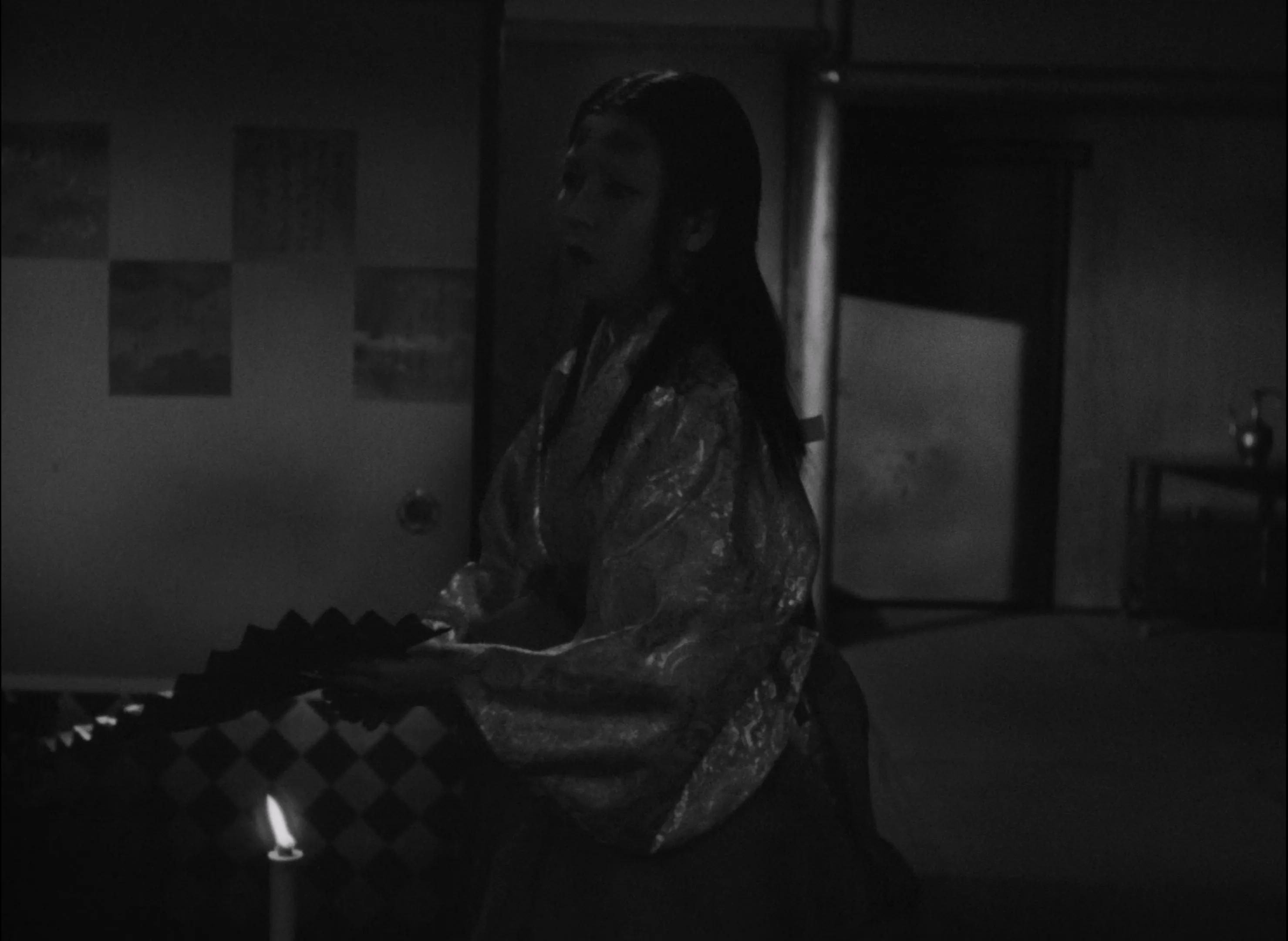 这种伦理上的审慎在《残菊物语》中得到了尤为明显的体现。在菊之助向观众们证明自己的演技时,阿德则一个人下至舞台下存放道具的地下室,默默地进行祈祷。此时,她的面孔又一次隐藏在阴影中。这既是因为此处的灯光暗淡,也是因为此时要对她的面孔进行正面表现似乎是不可能的。这时阿德或许在祈祷着菊之助的成功,也或许在为即将到来的分别感到痛苦,这些感情是我们无法知晓的。最重要的是,此时的阿德已经变成了一个被死亡所笼罩的的人。正如本片前面已经向我们展示过的那样,阿德的身体状况并不很好。此刻,她一个人来到这个黑暗的、与光的世界分离的空间,也许也是因为在她的身体上已经存在着所有表象的不可能性,也就是死亡。