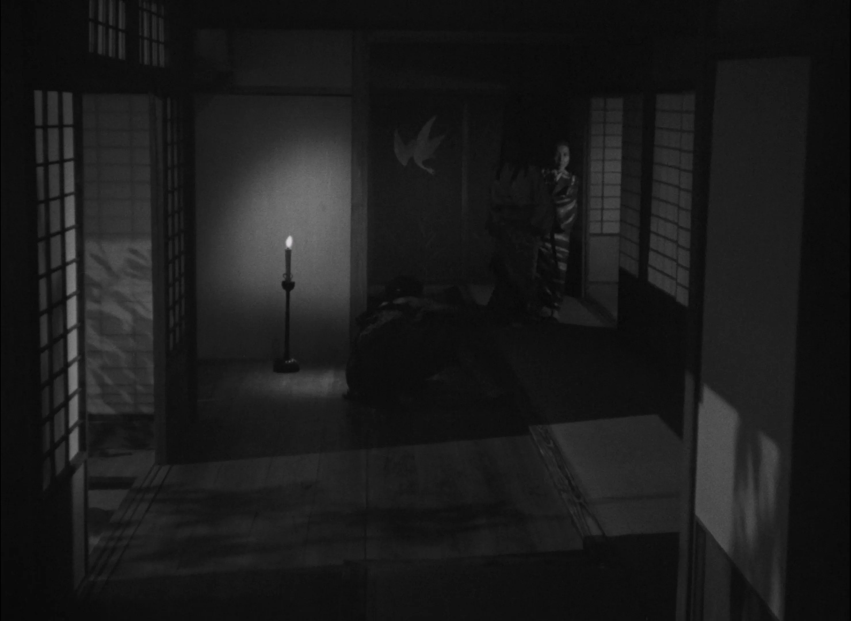 在若狭唱歌跳舞的镜头中,音乐中慢慢地浮现一个男声吟唱。此时,本来被光线所照亮的若狭突然被黑暗笼罩,脸上露出惊惧的神情,手中的扇子也落在地上;镜头缓缓摇向摆在房间一角的武士头盔,男声吟唱也随之加强。仅仅通过一个镜头,沟口就让电影从美丽转向了恐怖,从生命与爱的歌声转向了死亡的低沉呼唤。死亡在这里是作为一种无情的、非人的律法出现的,它好似在提醒着若狭,她是一名死者,本不该在人世活动。仅仅通过光线明暗在转瞬间的变化,沟口就把光与暗分别和生与死联系起来,使对立的、难以弥合的东西在一个镜头中共存。而在之后十郎发现真相、与若狭分别的时候,若狭回归冥界的动作也是通过不断退行至黑暗中的动作得到表现的。