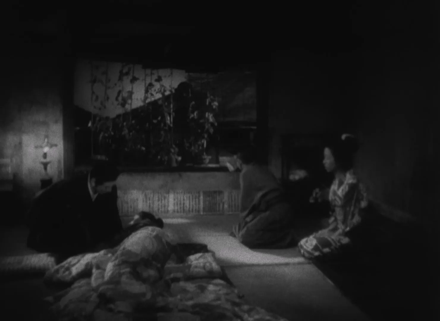 对死亡的表现构成了沟口电影的伦理的另一个维度。在《残菊物语》中阿德临终一场戏中,当来看望她的菊之助走上楼梯,我们会非常惊异地发现,摄影机来到了一个新的角度,拍摄到了之前我们从未见过的、这个房间的另一侧。在这个“正反打”之前,观众几乎不会在意房间的另一侧,而这个直到最后才出现的另一侧似乎正代表了摄影机进行观看的局限性。沟口特意在阿德死亡的场景才拍摄房间的这一侧,似乎是把本身联通的两个空间分隔为了分属生与死的两个领域。正是因为沟口擅长使用长镜头表现被门等要素所分隔的连续的空间,对被分隔的空间的穿越就显得格外重要,带有了非常强烈的伦理意味;而在此处,沟口特地用两个镜头来表现这个并未被任何东西所分隔的空间,这种处理似乎在同一个空间中制造了摄影机无法跨越的隔阂。除此以外,在阿德死亡的场景中,镜头从未靠近阿德,只是远远地拍摄她卧于地板上的身姿。就这样,沟口不仅拒绝了对人物的死亡的任何崇高化表现,也利用剪辑体现了对摄影机目光的局限性的反思。