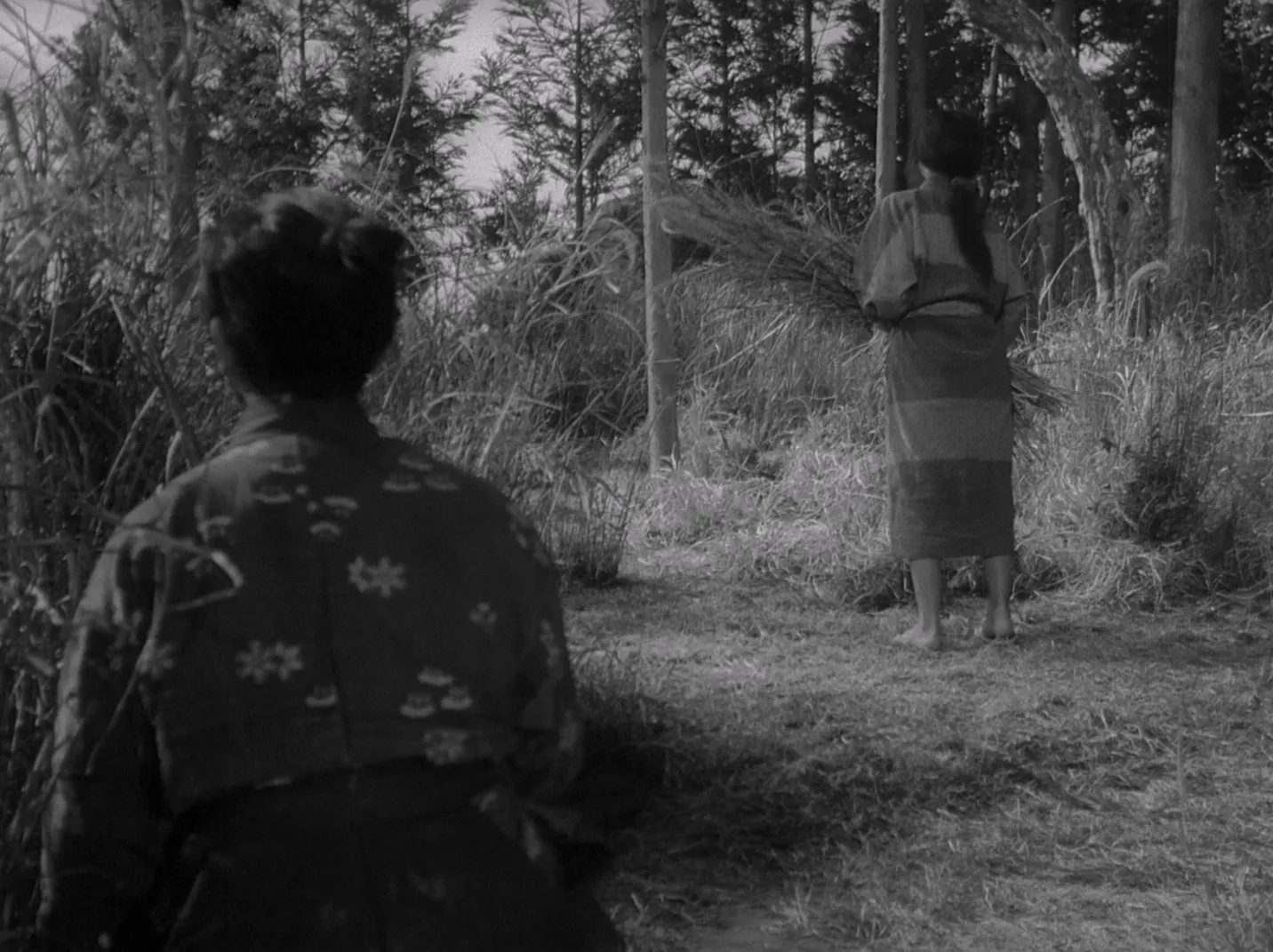 在《山椒大夫》中,母亲的歌声则构成了另一种非人的呼唤。玉木对儿女的思念过于强烈,以至于她的歌声脱离了她的身体,飘过海洋传到了安寿的耳中。在这个场景中,歌声渐渐脱离了歌唱者在场的身体,转而萦绕在安寿的耳边。镜头跟随安寿慢慢行至房间的角落,最终坐倒在地,眼睛望向画框外部。在《杨贵妃》中贵妃与玄宗初遇的场景中,贵妃也是跪坐在地,注视着画框外,聆听玄宗的琴声。在这些场景中,与若狭的呼声相似,人的存在脱离了他们身体的在场,转而变为一种曲调,而这些曲调比任何动作、表情都有力,直接地传达着角色存在的风格。